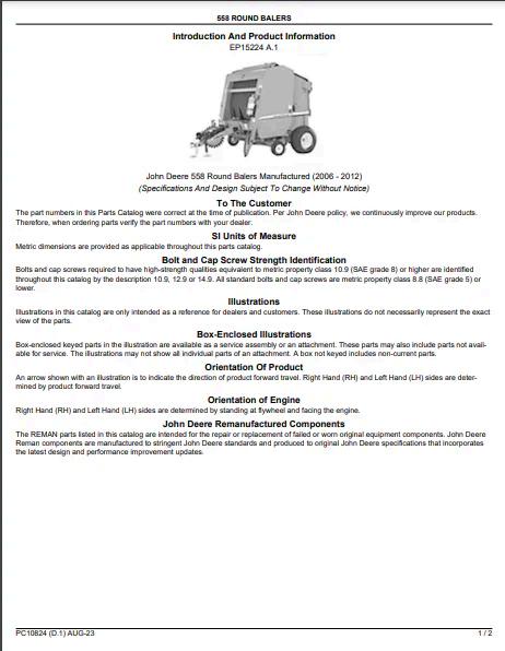 John Deere 558 - Baler Round Parts Catalogue Manual (PC10824)