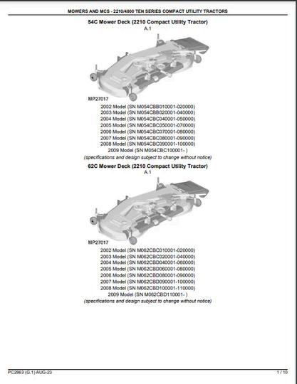 1. Explore the comprehensive John Deere 62 - ATTACHMENT, MID-MOUNT ROTARY MOWER, MOWER DECKS, AND 3-BAG MCS (2210 AND 4X10 SERIES CUTS) Parts Catalogue Manual (PC2863) on our website.