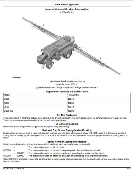 1. Explore our comprehensive John Deere 800R APPLICATOR Nutrient Applicator Parts Catalogue Manual (PC16138) for all your agricultural needs.