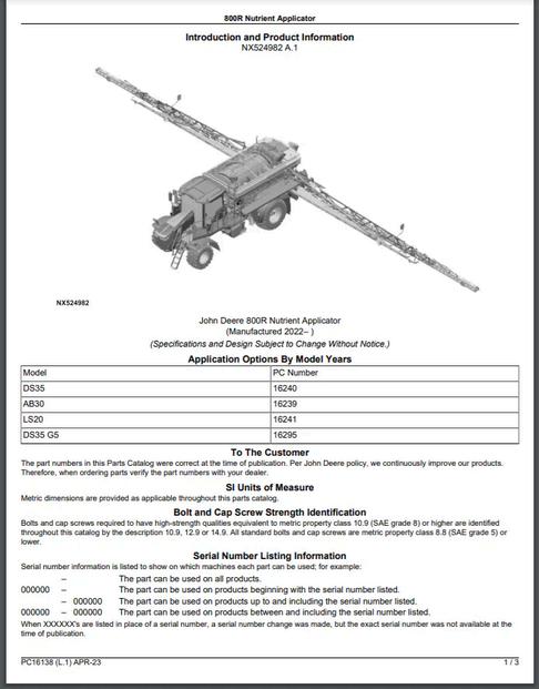 John Deere 800R Nutrient Applicator Parts Catalogue Manual (PC16138)