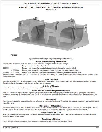 1. Find genuine John Deere PC9879 parts and accessories in our comprehensive manual. Browse through AR12, ATTACHMENTS AD11, AD12, AM11, AR10, AR12, AY11, AY12 and more.