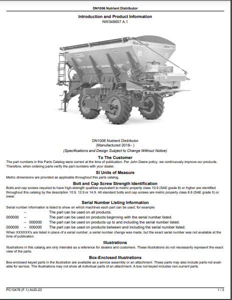 1. Explore our comprehensive John Deere DN1006 APPLICATOR Nutrient Distribator Parts Catalogue Manual (PC13476) for all your agricultural needs.