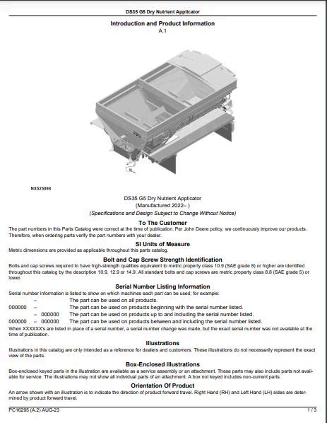 1. Explore our comprehensive John Deere DS35 G5 - APPLICATOR G5 parts catalogue manual (PC16295) for all your dry nutrient applicator needs.