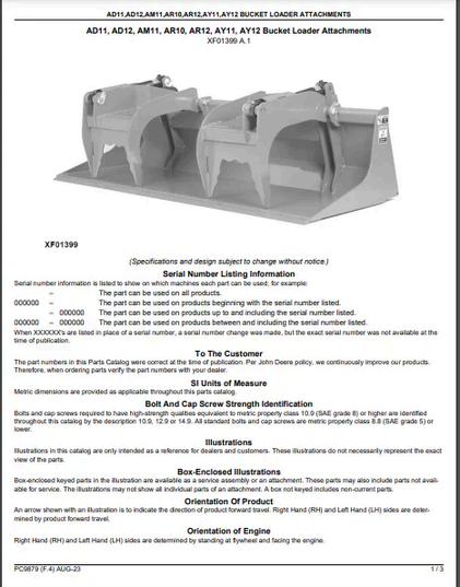 1. Find the perfect John Deere Parts Catalogue Manual PC9879 for Frontier Attachments AD11, AD12, AM11, AR10, AR12, AY11, AY12 Bucket Loader at our website.
