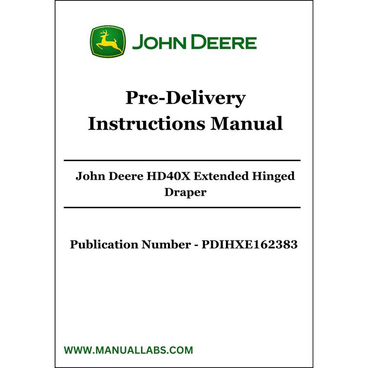 Get detailed pre-delivery instructions for the John Deere HD40X Extended Hinged Draper with our comprehensive manual. PDIHXE162383.