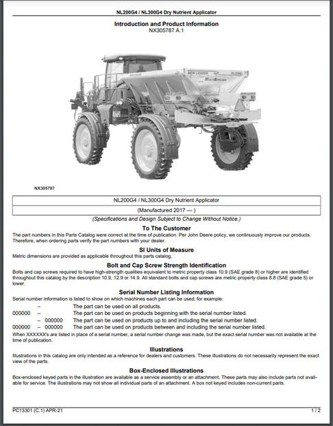 1. Explore our website for the John Deere PC13301 Parts Manual and NL200G4 Dry Nutrient Applicator. Find all the information you need in one convenient place.