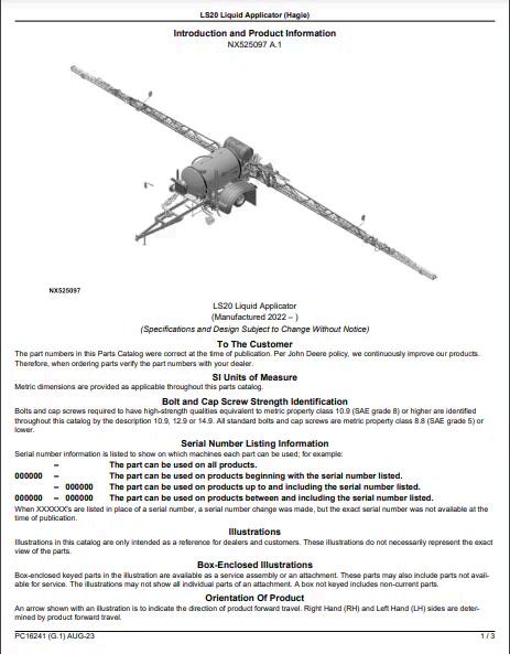 3. Access the John Deere HAGIE - APPLICATOR LS20 Liquid Applicator (Hagie) Parts Catalogue Manual (PC16241) on our website. Discover all the necessary details for effective maintenance and repairs.
