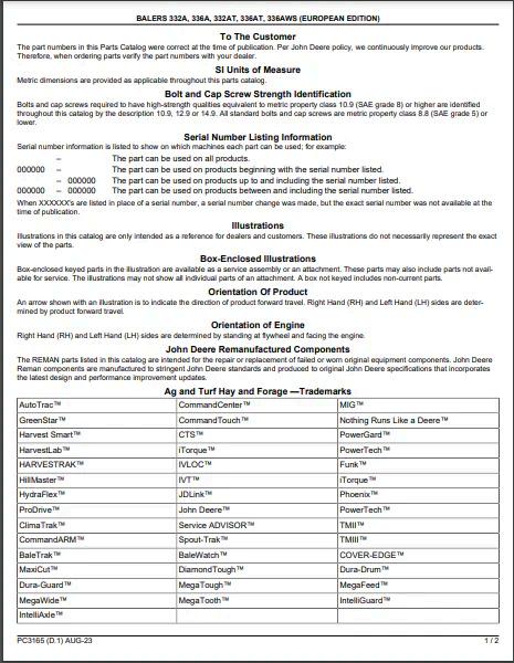 Explore our comprehensive John Deere 336AT - Baler 332AT, 336AT, 336AWS Balers Parts Catalogue Manual (PC3165) for all your baler needs.