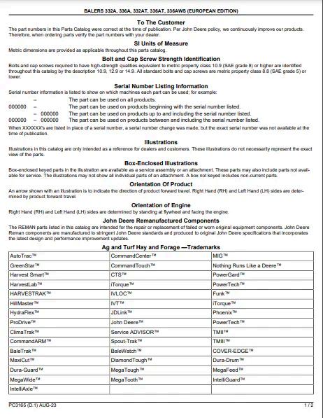 Discover a comprehensive parts catalogue manual for John Deere 336AWS - Baler 332AT, 336AT, 336AWS Balers. Find all the essential parts you need in one place.