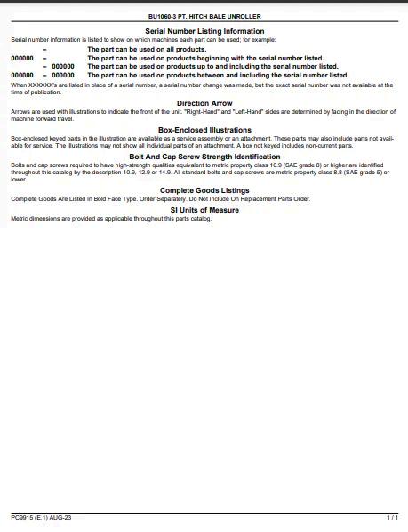 1. Discover the comprehensive parts catalogue manual for the John Deere Bu1060 3-Point Hitch Bale Unroller (Frontier) on our website. Get the best deals now!
