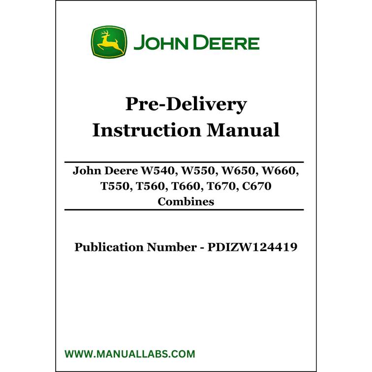 1. Discover the comprehensive pre-delivery instruction manual for John Deere W540, W550, W650, W660, T550, T560, T660, T670, C670 Combines - PDIZW124419.