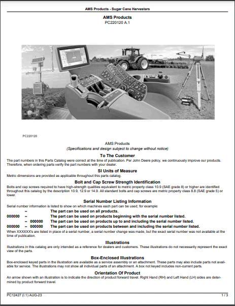 1. Explore our comprehensive AMS Sugar Cane Harvesters Parts Catalogue Manual (PC12427) for John Deere sugar cane harvesters. Find all the parts you need in one place!