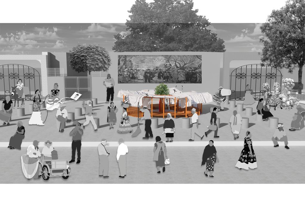 Estructura de madera modular compuesto principalmente por vacíos y algunas cubiertas de malla sombra. Crean una atmosfera en el espacio sin afectar las actividades que ya se realizan en el sitio