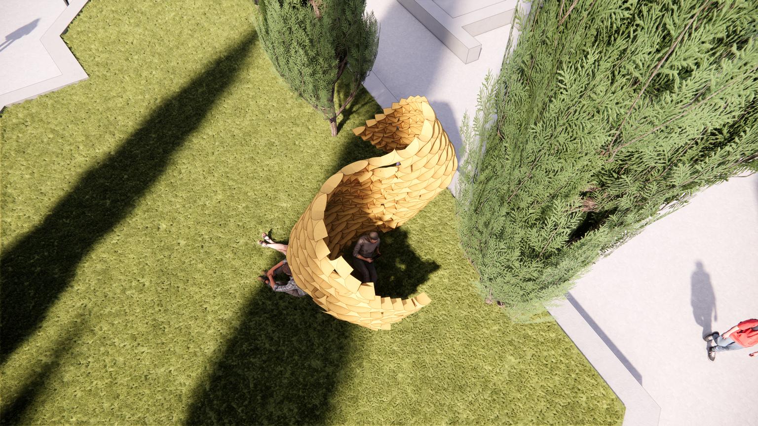 The soul-tree es un pabellón reutilizable buscando así que este sea reciclado o reutilizable y a su vez buscando que cada usuario tenga una intersección entre espacio, arquitectura y usuario