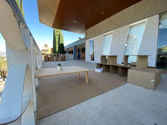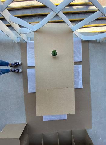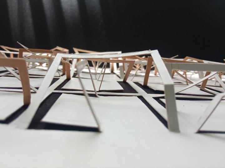 Estructura de madera modular compuesto principalmente por vacíos y algunas cubiertas de malla sombra. Crean una atmosfera en el espacio sin afectar las actividades que ya se realizan en el sitio