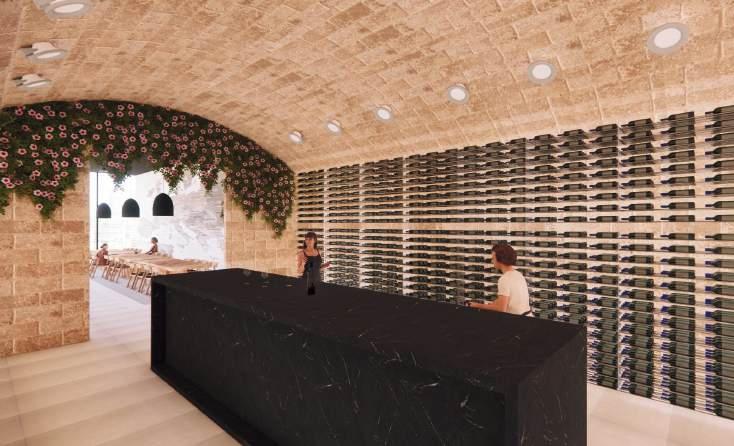 The Space has two entries. The first entry faces the Wine Tasting Room. In the wine tasting room, there are different types of wines from all around Europe. Here people will be able to experience some wine tasting and choose the ones they want to take home. Also, this room is available for people to rent for work events. The design decision of this room is inspired by the very famous Italian wineries, with the curved and bricked ceiling giving the feeling of an underground space.