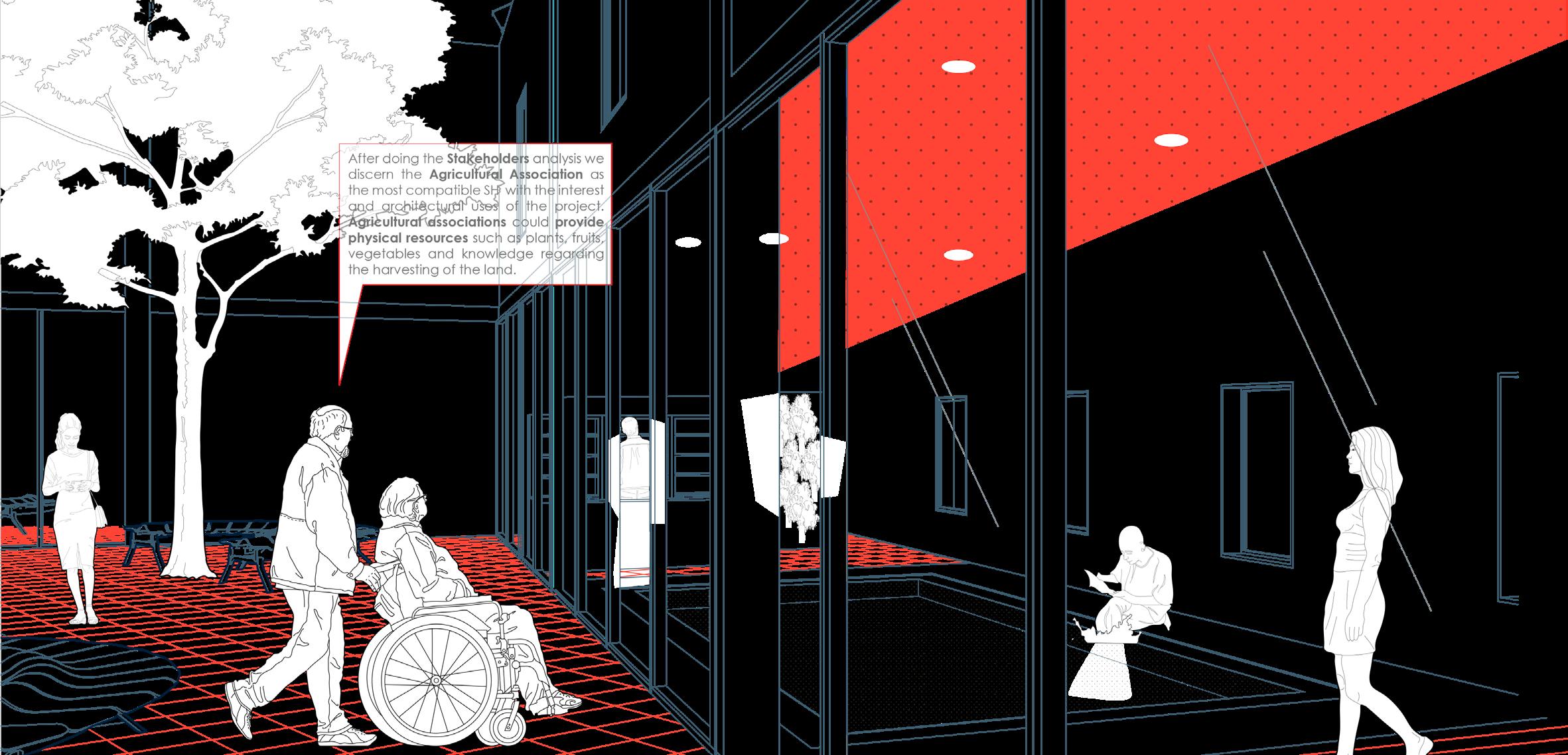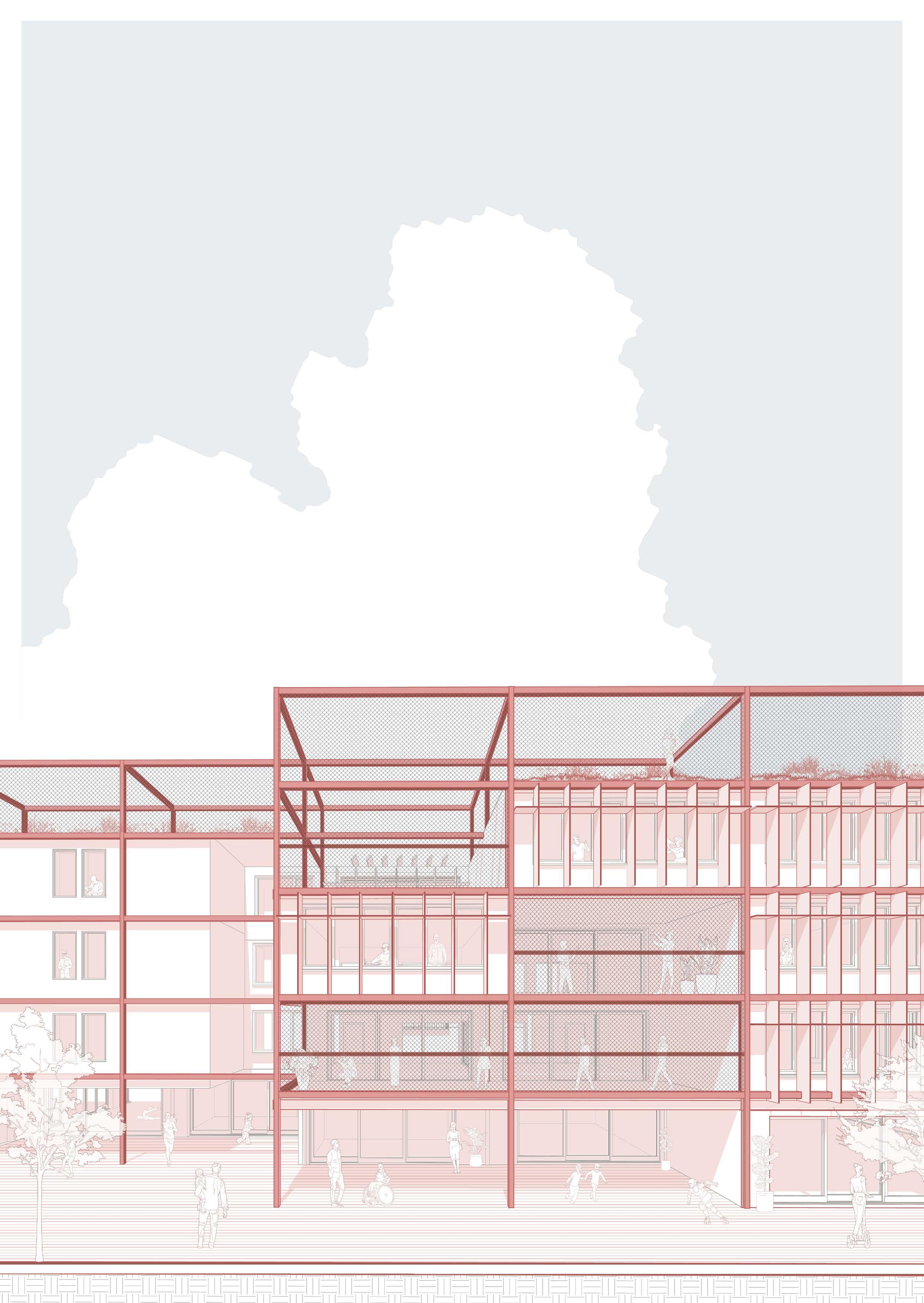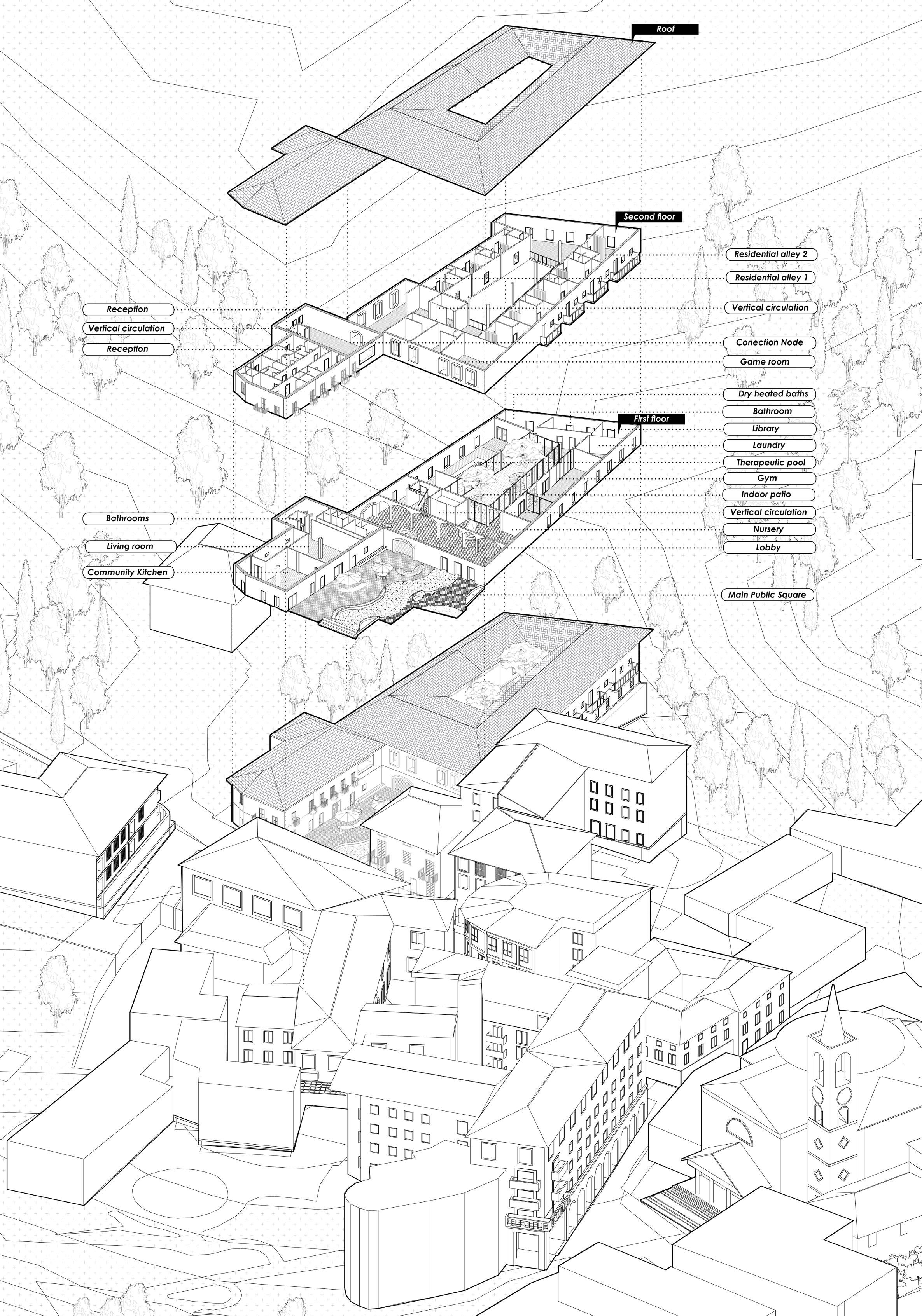The architectural design itself features the creation of spaces for exchange and interaction between the productive/ working community and the elderly population, regarding the 3 sustainable aspects, social, economic, environmental with a project responsive towards an existing phenomenon (constant aging population) in a local and provincial level regarding to residential proposal + services for the community in the center of the city as a response to an unplanned urban spread. The architectural program is composed by a residential and recreational project for the elderly, integrating it with commercial uses for the rest of the community of the town. The circulations where carefully designed considering the population with reduced mobility and their transition from public to private areas of the building. Moreover, the public space design opens up a main square, collecting the main flows from the street, improving the general profile and allowing a permeable relationship, serving the community as an outdoor market, a gathering space and a garden.