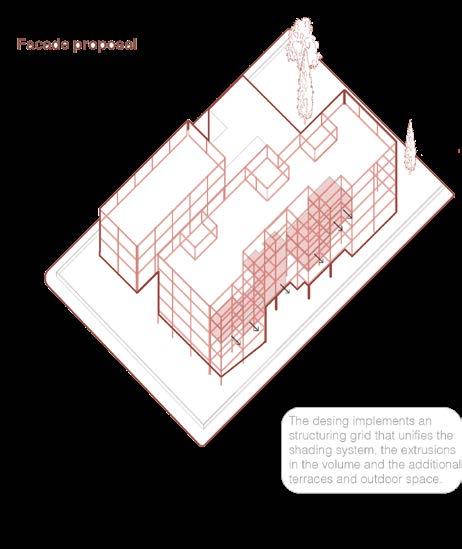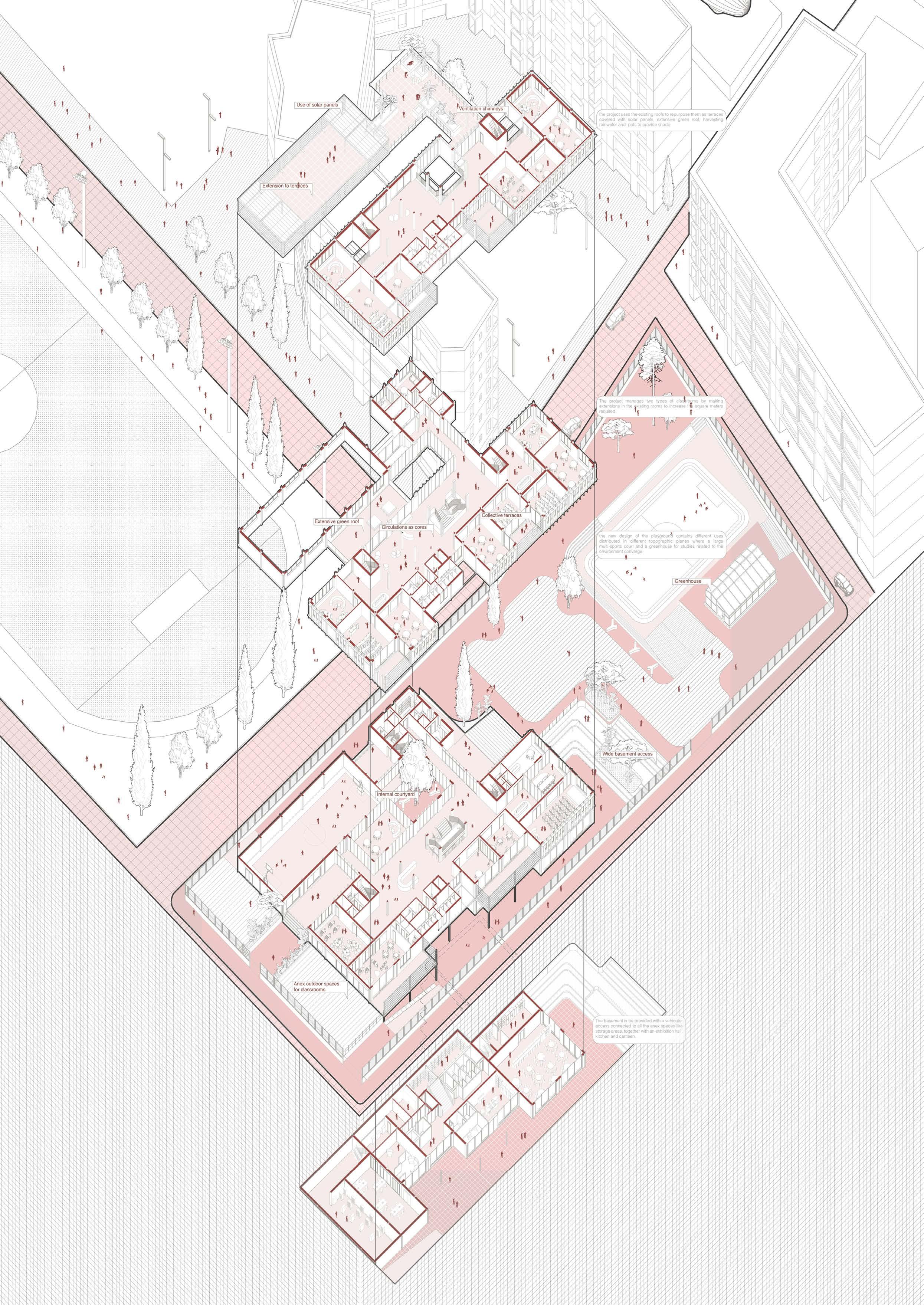 Description: Within the main architectural composition of modern day cities, it is possible to identify educational infrastructure as one of the main elements in the urban landscape. The Green Building atelier, identifies a series of school typologies that are repeated and distributed around the city of Torino. These typologies were built during the 60ths, a period of high demand for educational infrastructure, which led to fast solutions for the construction of school buildings. However, efficient these school models could have been in the past, they have started to show an insufficient performance in relationship with emerging methodologies and educational models, distribution and use of spaces, and building sustainability. In this specific case, the project is based on one of the many existing typologies in Torino (Lancia Topology – Castellino 10). Moreover, to tackle the problematics related to this specific school, the design process included a series of changes in order to achieve a sustainable and efficient functioning, both in terms of its architectural needs and physical performance of the building. The development of the project comprehends the general redistribution of spaces and uses, a new design for the façade and envelope and a new approach for the exterior areas that surround the building and allow it to connect with its surroundings.