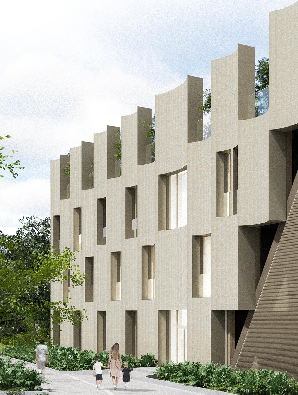 Furthermore, the circularity of the building is increased by an efficient and sufficient choice of materials and detachable construction. In this way, the goal of reducing the carbon footprint and planning and building to conserve resources is achieved.