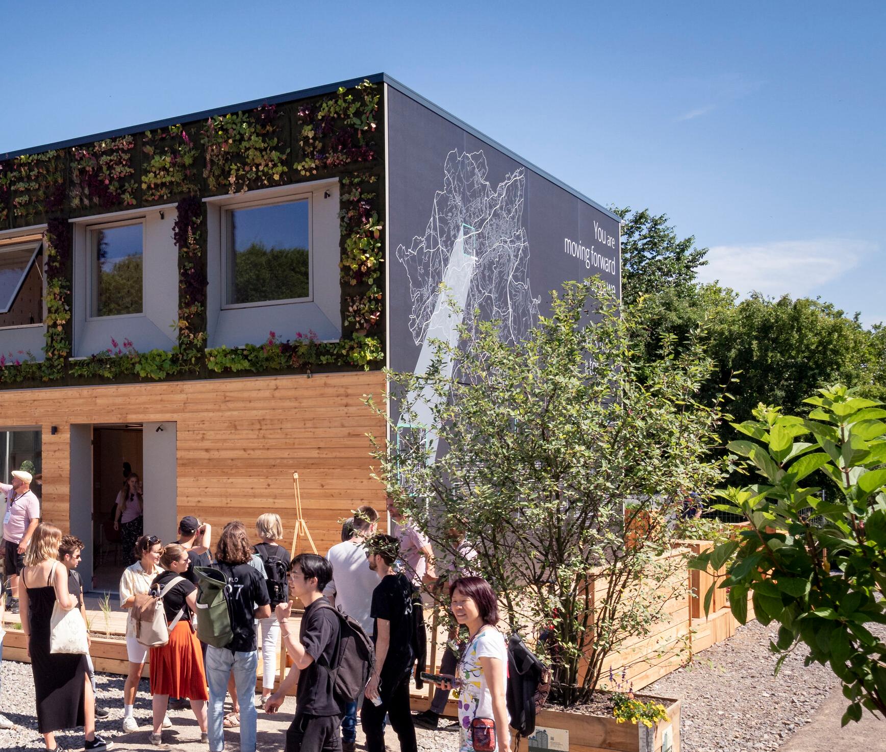 The demonstrator (hdu), which consists of ten solid timber modules, was built with mostly detachable, reusable and ecofriendly materials and construction methods. The facade picks up on the photovoltaic panels, the wood cladding as well as the plant elements of the design challenge. In addition, the two outer walls with an air-cleaning textile reflect the neighbouring walls of the building gap. Finally, the energy concept with the PVT panels, the heat pump, the ice storage and the heating/cooling ceiling were also adapted.