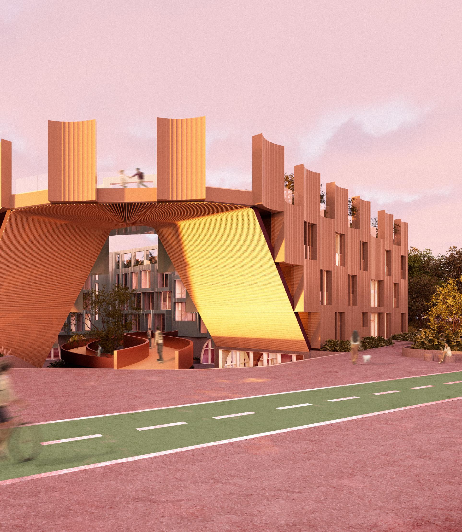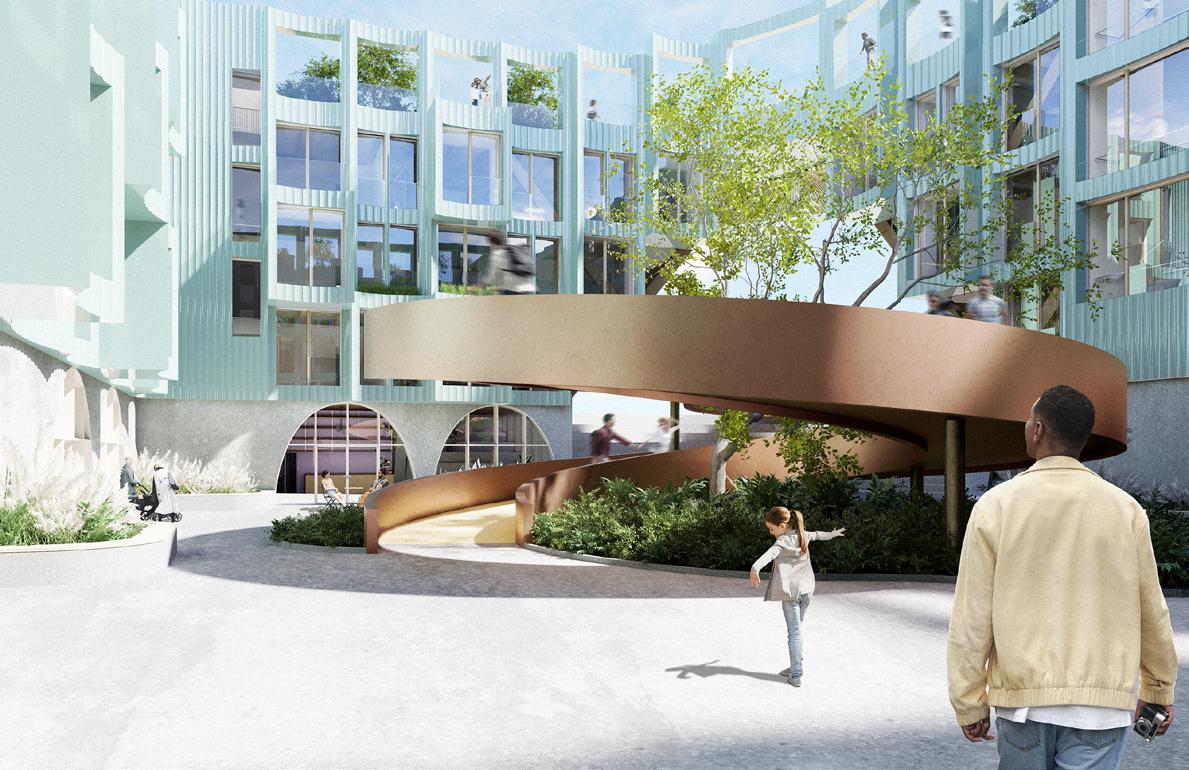 The perimeter block is lifted towards the access street leading to Dusseldorf centre, bringing daylight into the lowered courtyard and forming a welcoming gesture for everyone passing by. Inviting neighbours and visitors to take the spiralling walkway/ bicycle lane to meet up and shop for locally grown vegetables in the heart of the buildings, followed by a walk on the circular rooftop garden, which can be entered via one of the five cores.