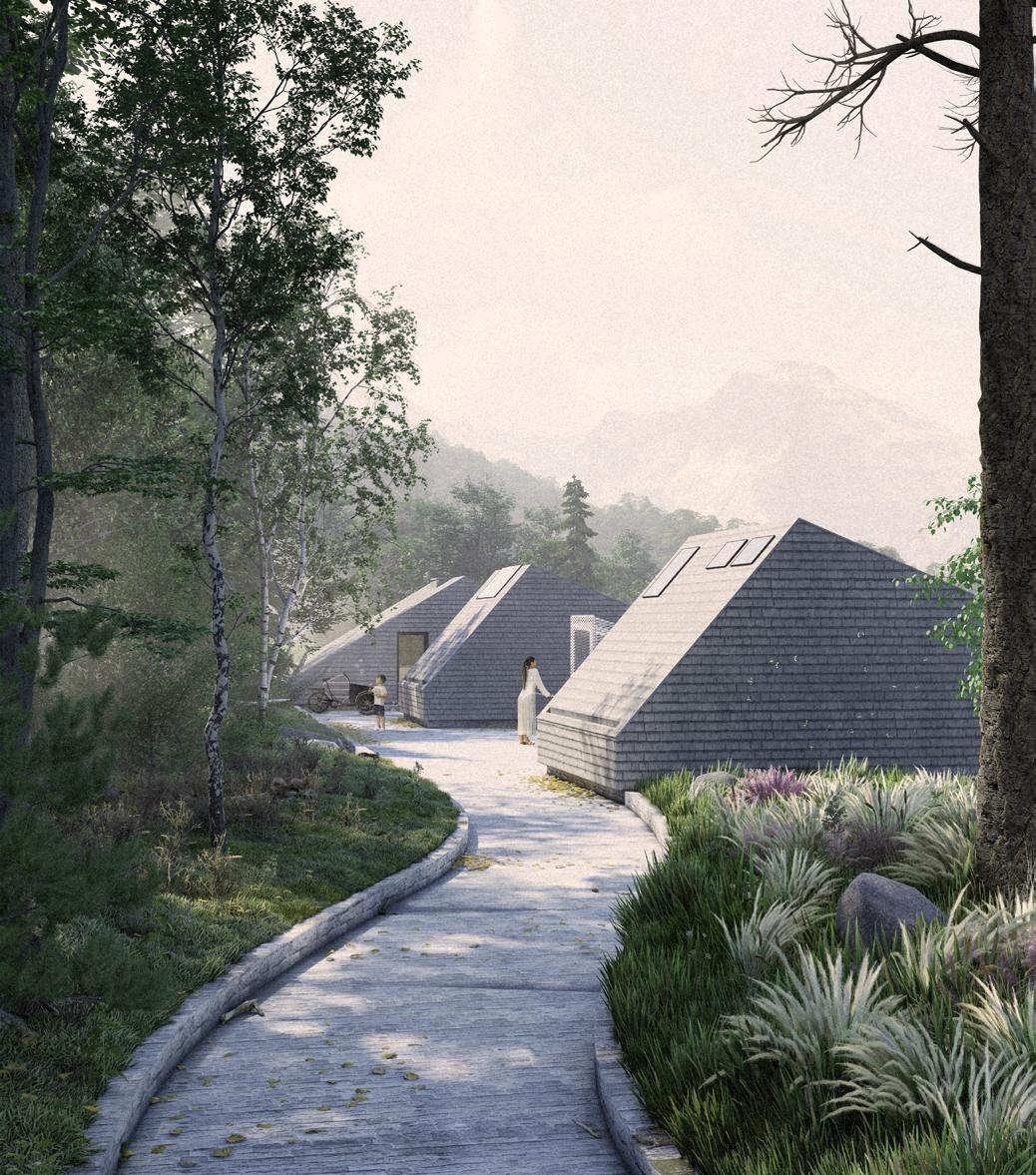 Instead of squeezing everything under one roof, it is divided and equalized. The four roofs form a unity nestling into the slope (3). Each house fulfills a curated purpose. This segmentation brings a variety of benefits to its inhabitants.