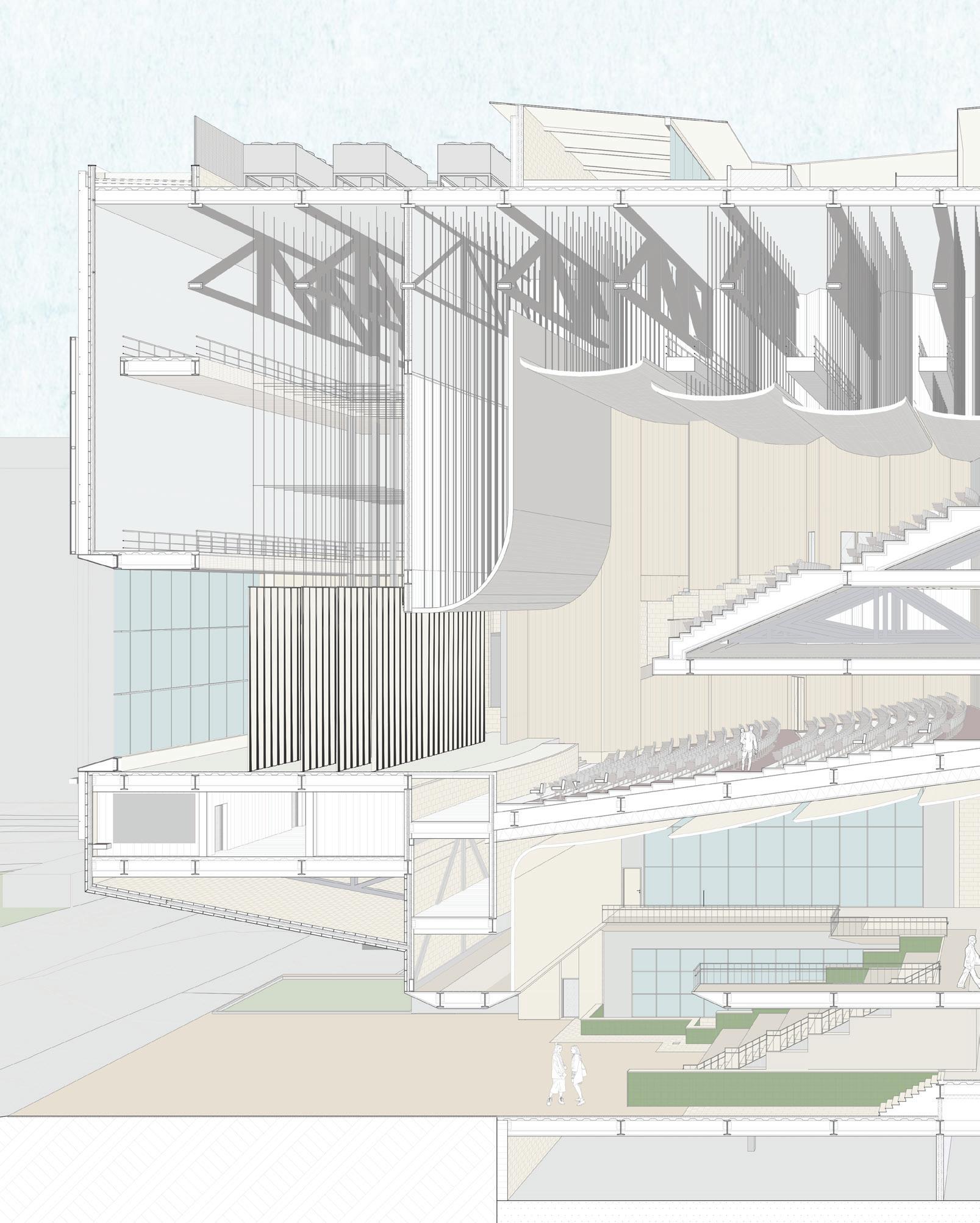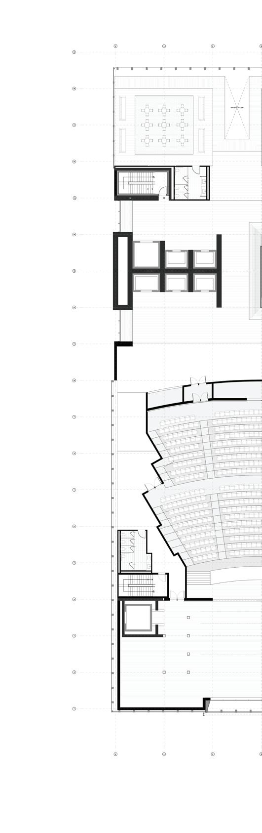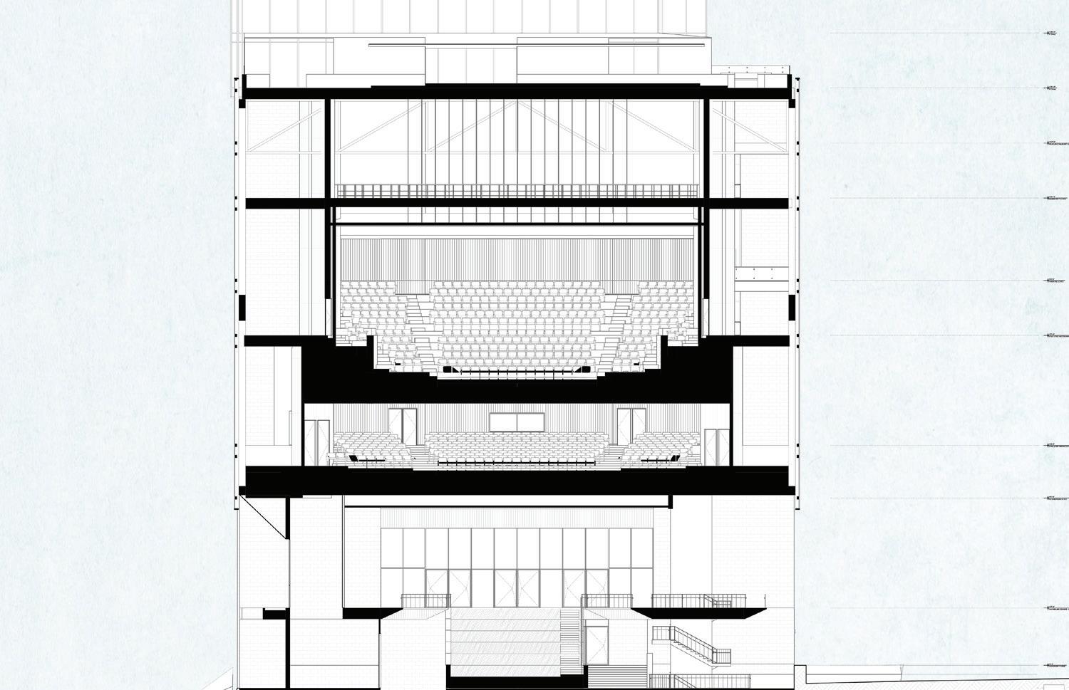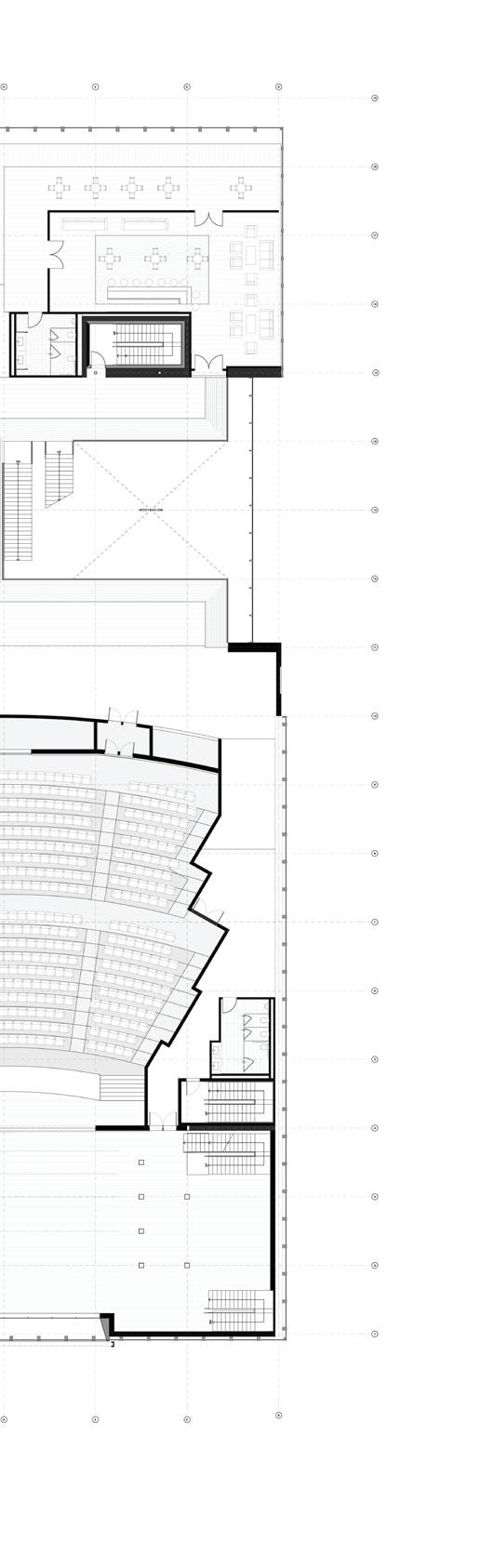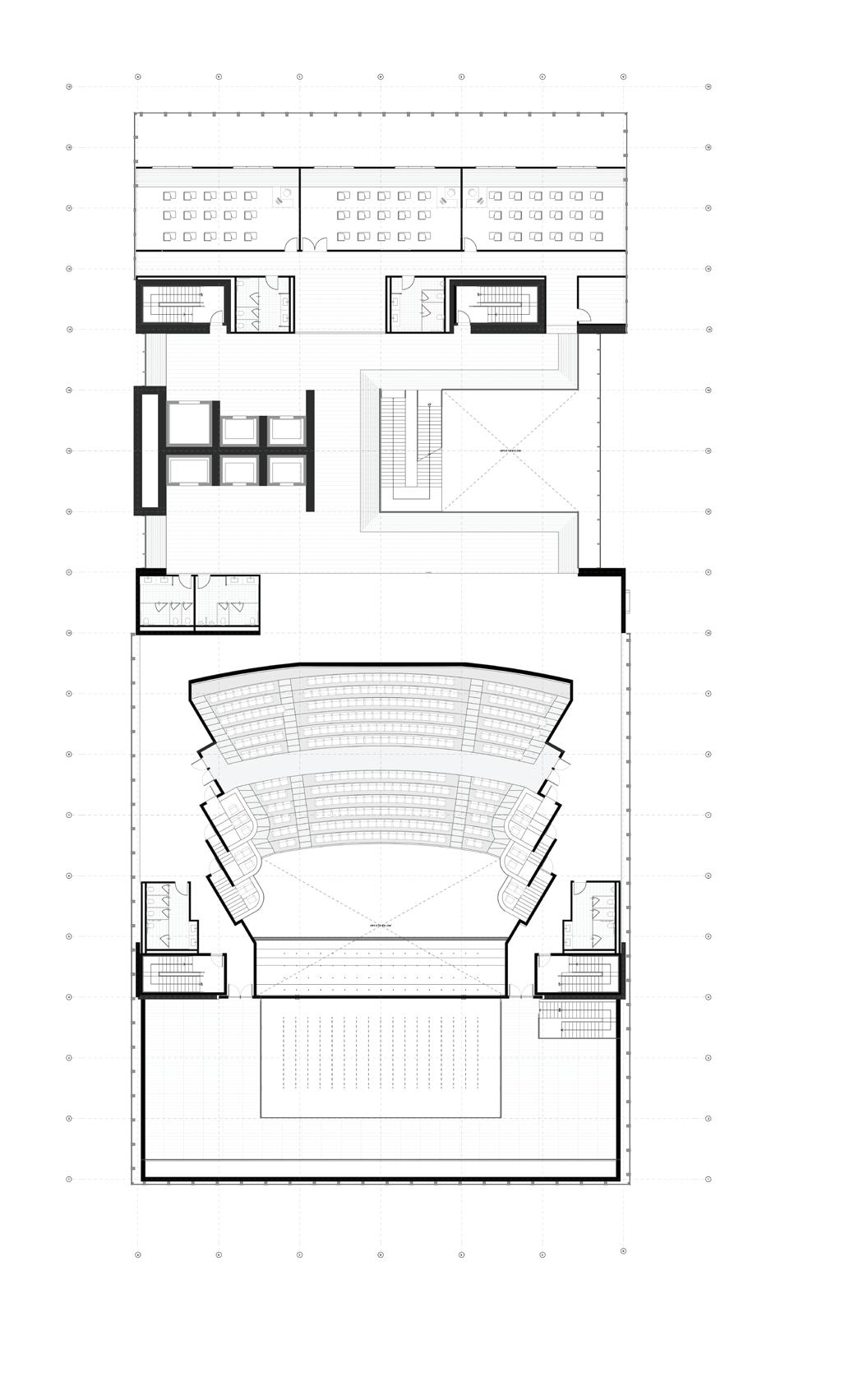 The essence of the theater is found in the performance, and the quality of the experience is measured by this metric. The building seeks to become a part of the performance, contributing to the physical and emotional experience of the place. The stage breaks from its proscenium boundary, capturing more than the auditorium within the veil of the performance.