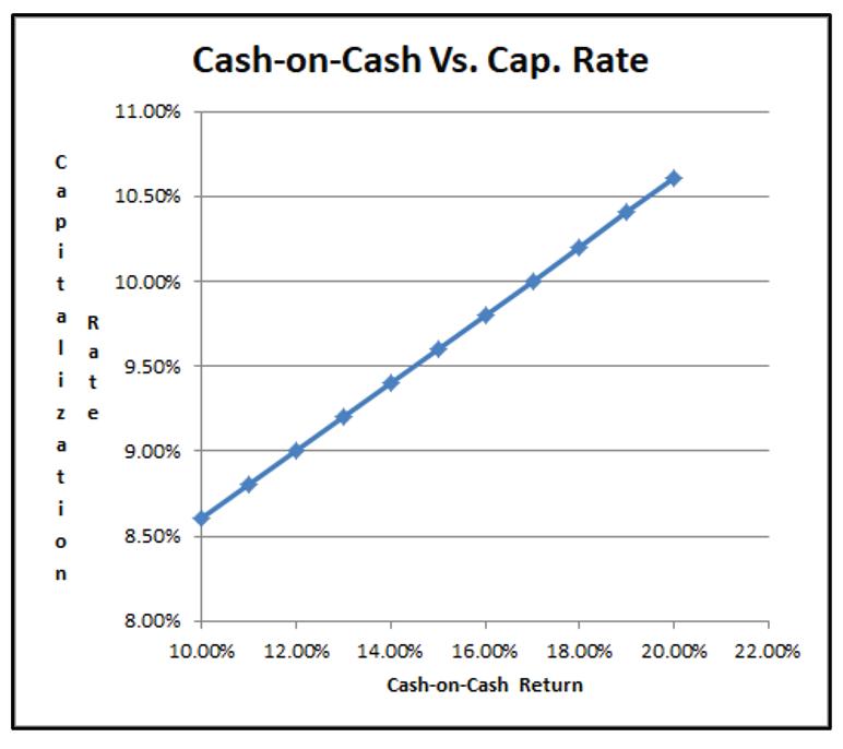 order to analyze the resulting capitalization rates. At the cashon-cash rate of 20%, the corresponding capitalization rate was 10.6%. Hence, the 3% spread rule was off by 210 basis points. The capitalization rate needed to be 5.10% higher than the interest rate to achieve 20% cash-on-cash, not 3.0% higher. Please keep in mind that the numbers were calculated with the debt assumptions held constant at a 5.5% interest rate, a 20-year amortization period, and an 80% LTV. The rate matrix will need to be recalculated each time the debt variables are tweaked.