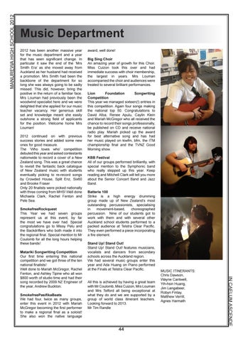 Music Department 2012 has been another massive year for the music department and a year that has seen significant change. In particular it saw the end of the ‘Mrs Smith Era’ as she moved away from Auckland as her husband had received a promotion. Mrs Smith had been the backbone of the department for so long she was always going to be sadly missed. This did, however, bring the positive in the return of a familiar face. Mrs Louman had previously been the woodwind specialist here and we were delighted that she applied for our music teacher vacancy. Her generous skill set and knowledge meant she easily outshone a strong field of applicants for the position. Welcome home Mrs Louman! 2012 continued on with previous success stories and added some new ones for good measure. The ‘Who loves who’ competition debuted this year and asked contestants nationwide to record a cover of a New Zealand song. This was a great chance to revisit the fantastic back catalogue of New Zealand music with students eventually picking to re-record songs by Crowded House, Split Enz, Six60 and Brooke Fraser Only 20 finalists were picked nationally with three coming from MHS! Well done Michaela Clark, Rachel Fenton and Pele Sea. SmokefreeRockquest This Year we had seven groups represent us at this event, by far the most we have ever had. Special congratulations go to Missy Pelu and the Backdrifters who both made it into the regional final. Special mention to Mr Coulomb for all the long hours helping these bands!