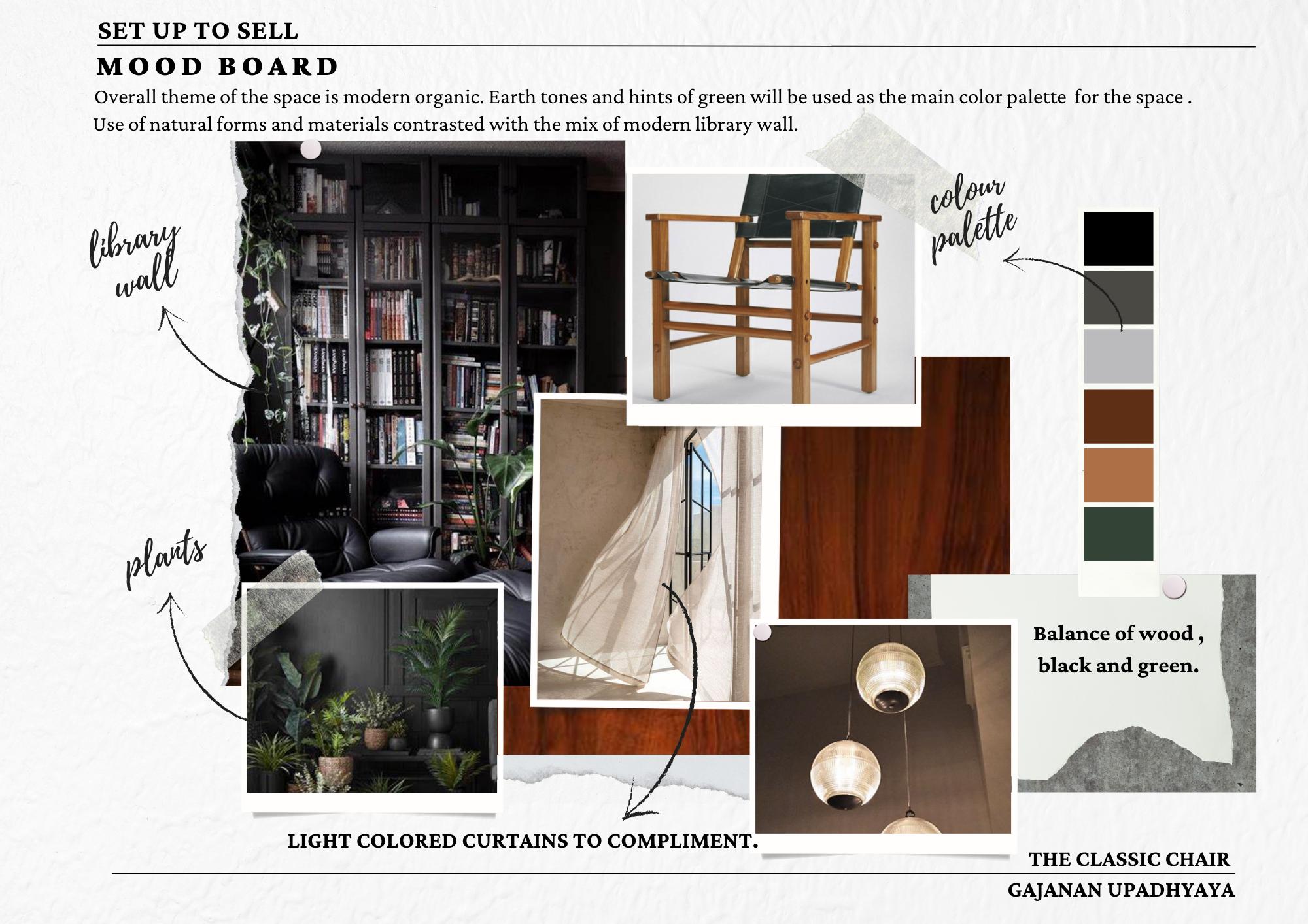THINKING OF SELLING THE CHAIR , WITH REFERENCE TO THE ABSTRACT . MAKING A MOOD BOARD TO GO WITH THE CHAIR AND IMAGINING THE POSSIBLE MATERIALS THAT MIGHT LOOK GOOD WITH IT