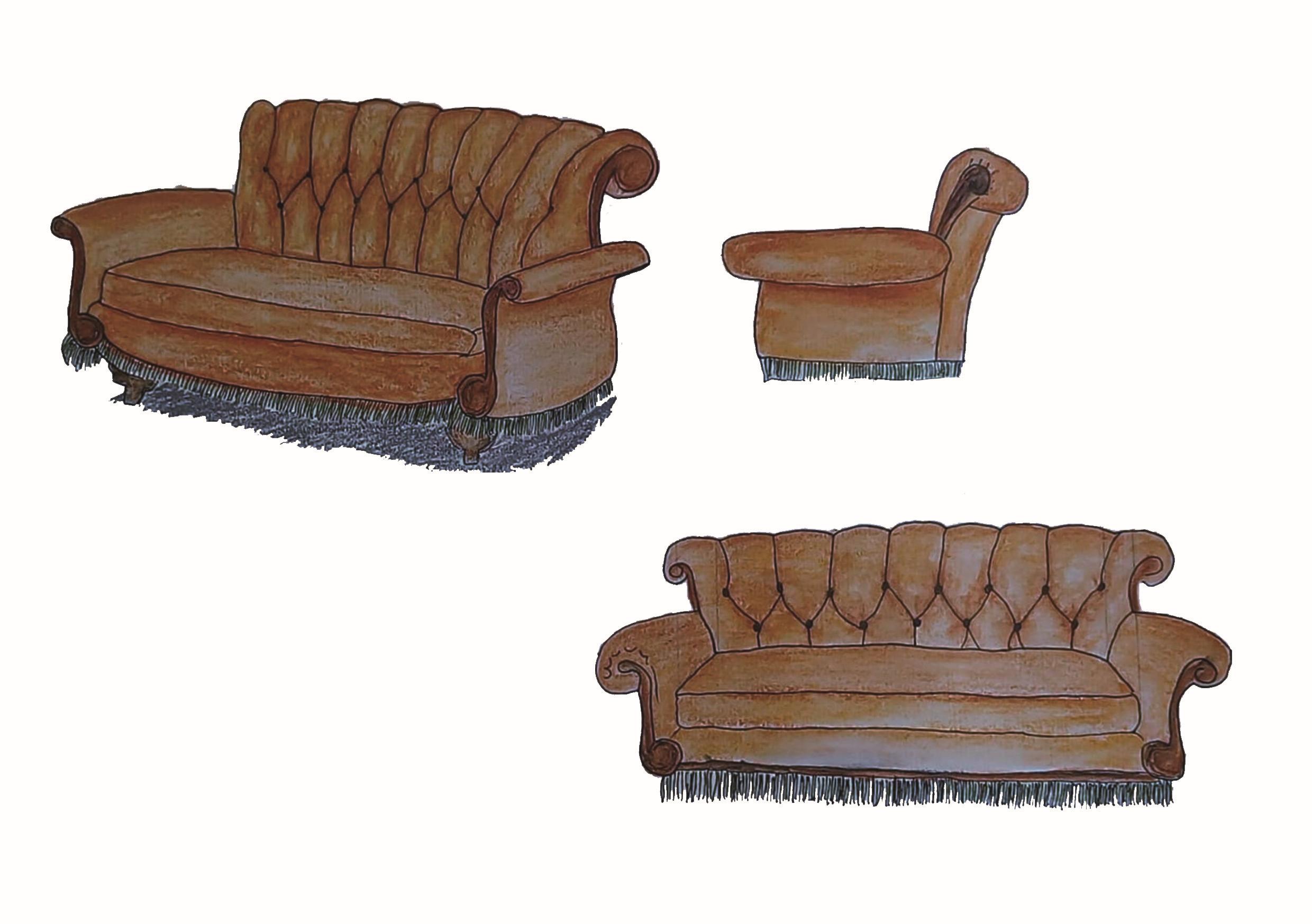 ' F R I E N D S ' . STUDYING THE SOFA AND ARRIVING AT THE DIMENSIONS TO MAKE THE DRAWINGS.