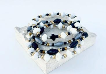 Mirielle Paper Bead Bracelet Set. The beads are made out of recycled newspaper and are glued, dried, and then painted.