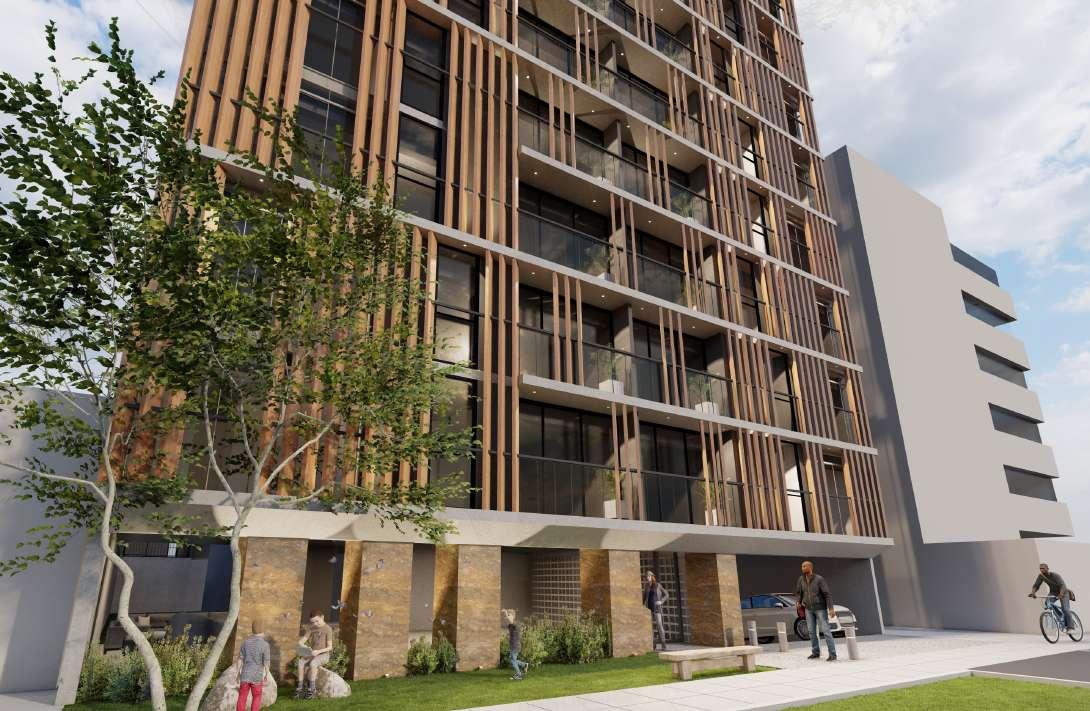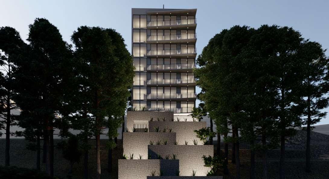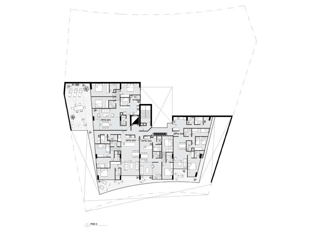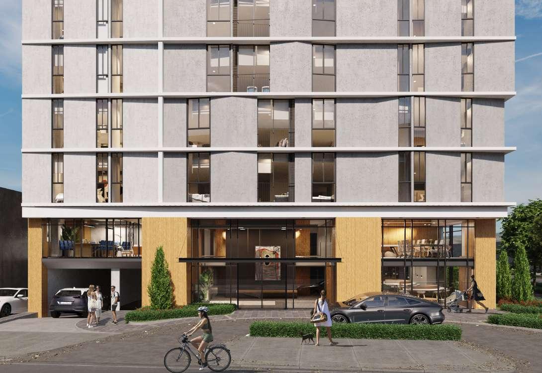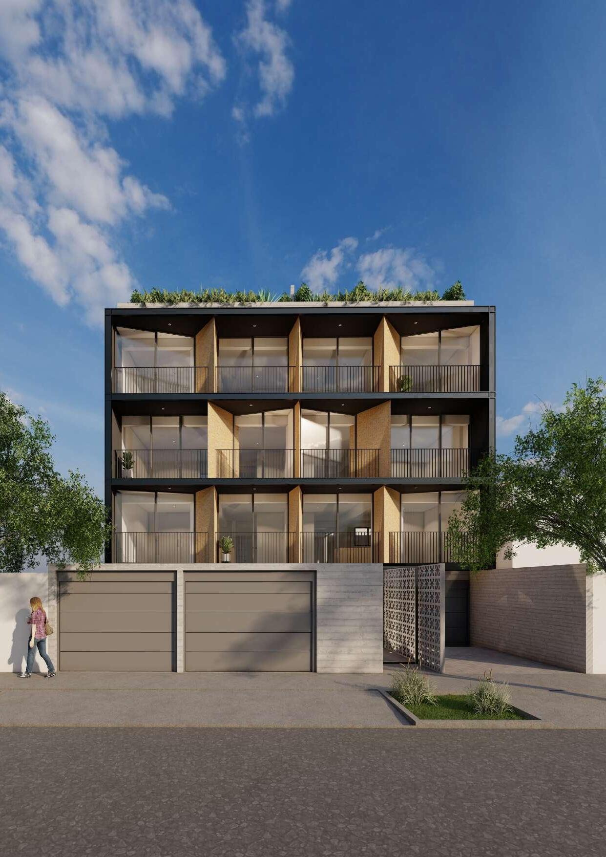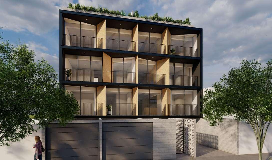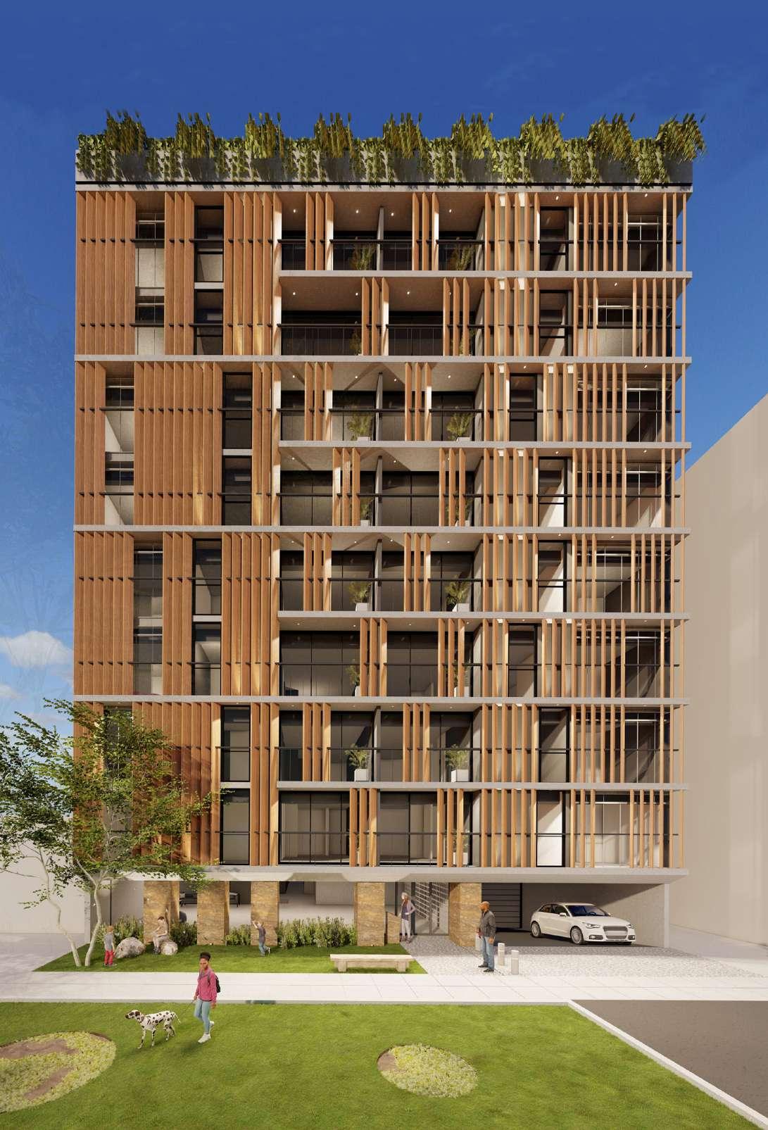 MAP. Propone un edificio retrancado lateralmente para que todos los departamentos tengan vista exterior y, a su vez, generar un espacio interesante donde los balcones de los departamentos cruzan como puentes en diferentes ubicaciones. Por el frente, un edificio bastante tradicional, espera a ver el interior.