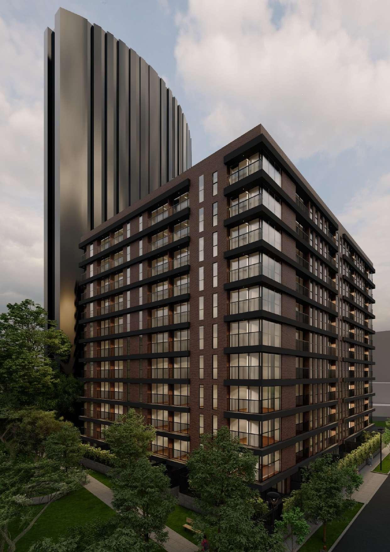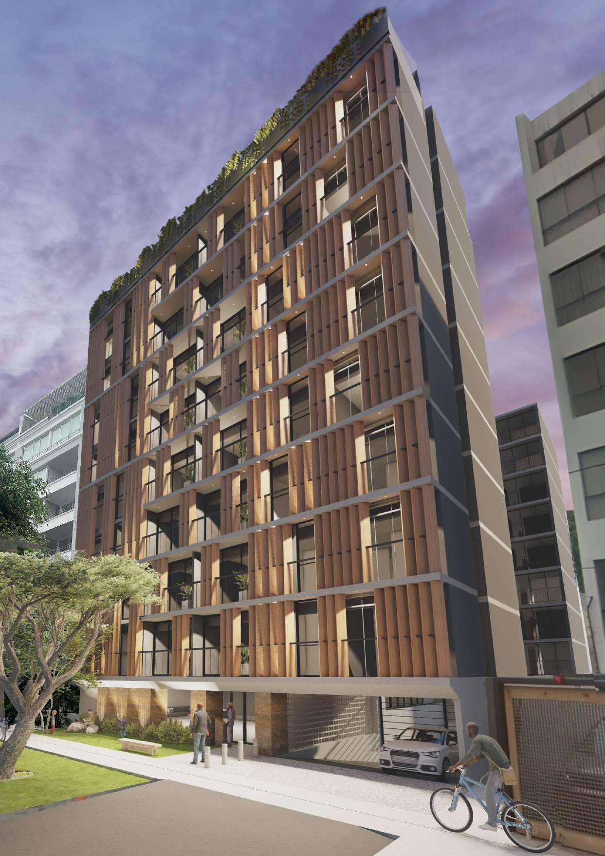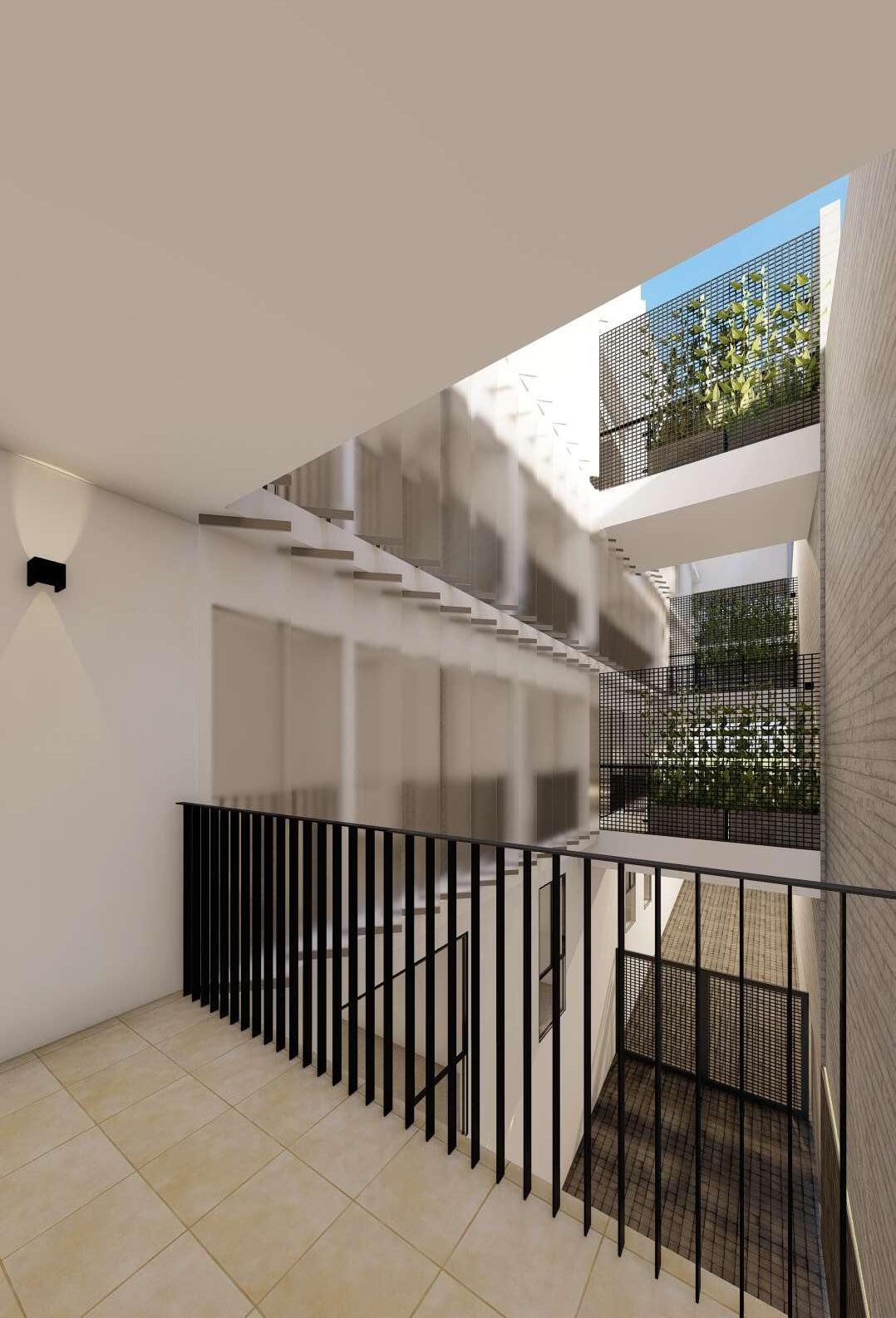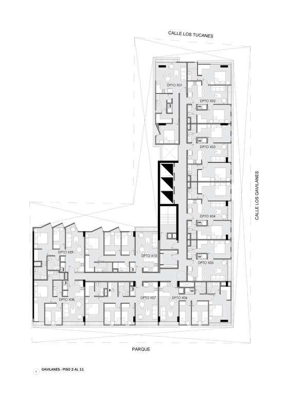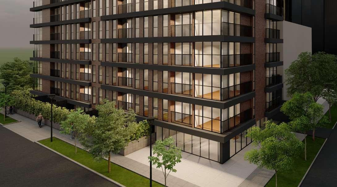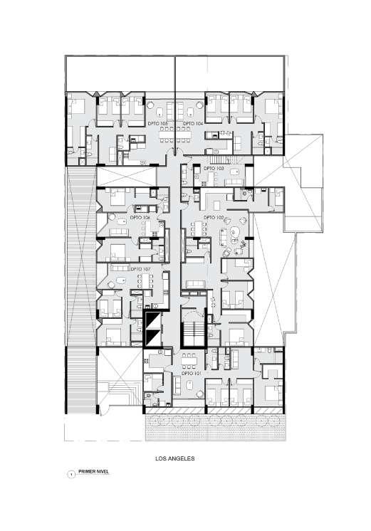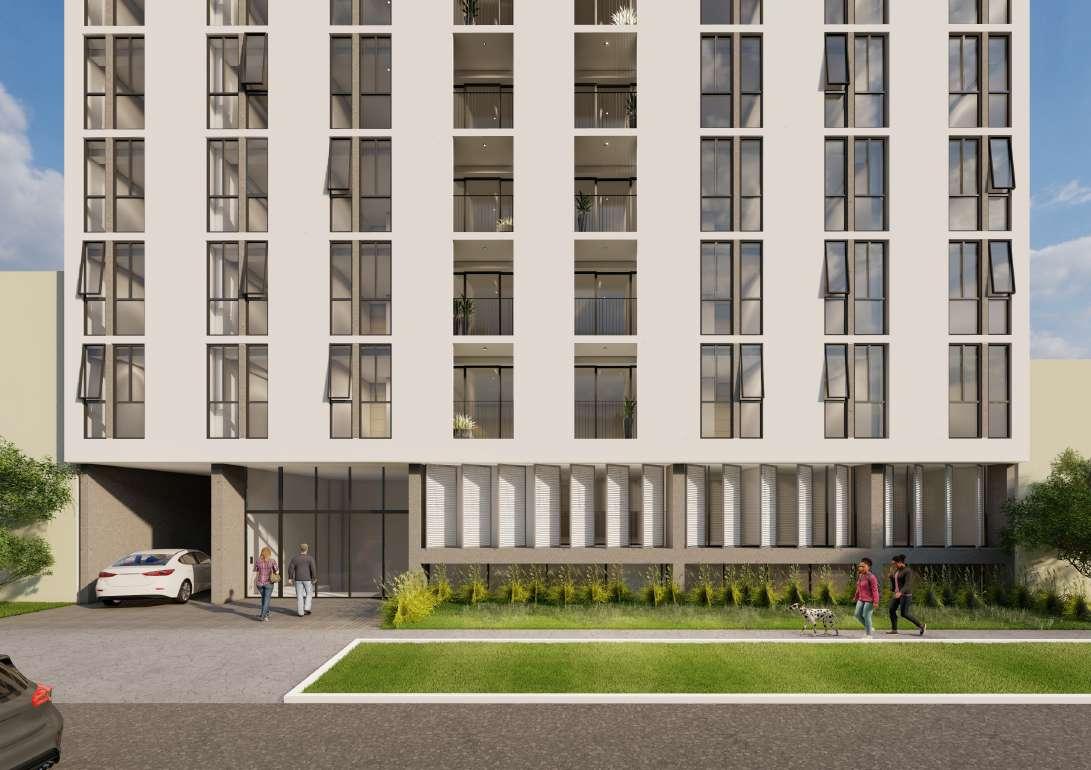MAP. Propone un edificio retrancado lateralmente para que todos los departamentos tengan vista exterior y, a su vez, generar un espacio interesante donde los balcones de los departamentos cruzan como puentes en diferentes ubicaciones. Por el frente, un edificio bastante tradicional, espera a ver el interior.