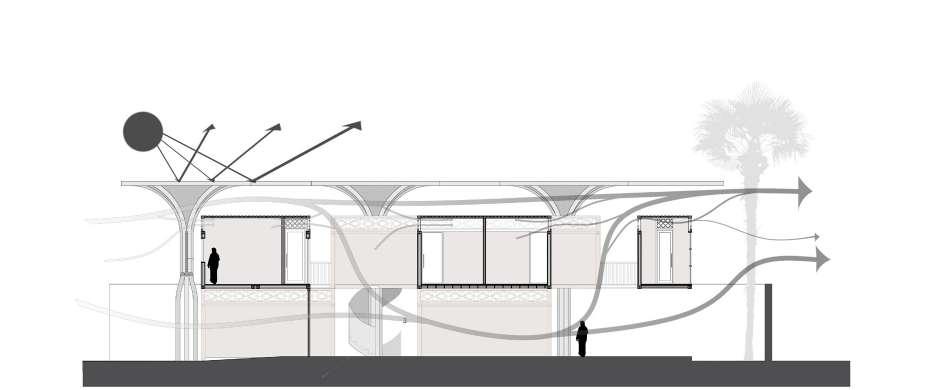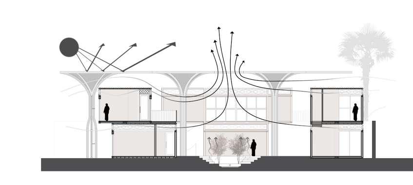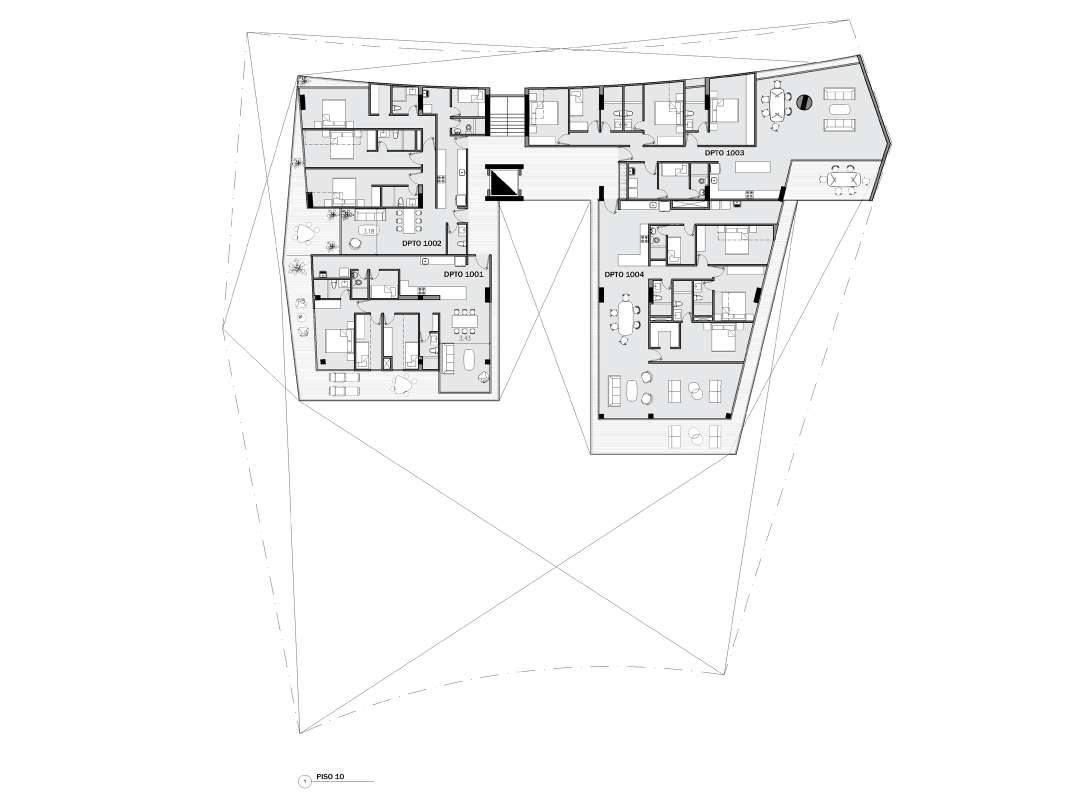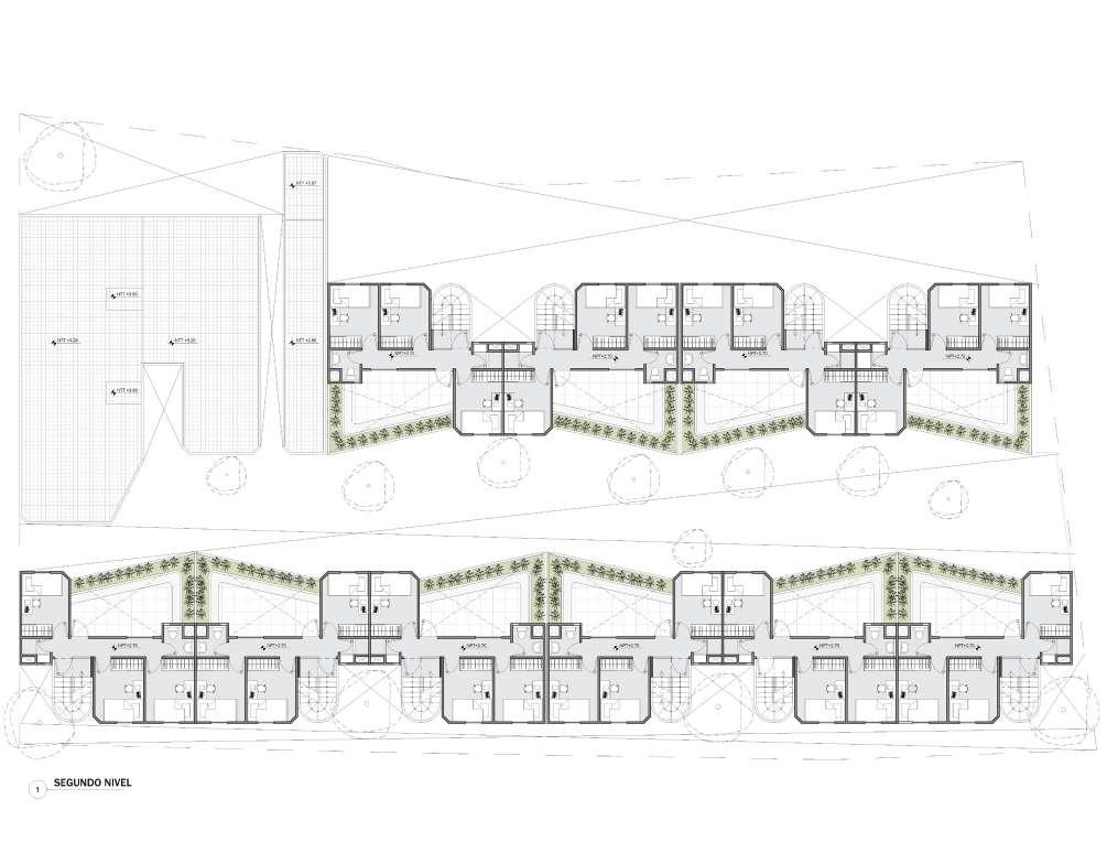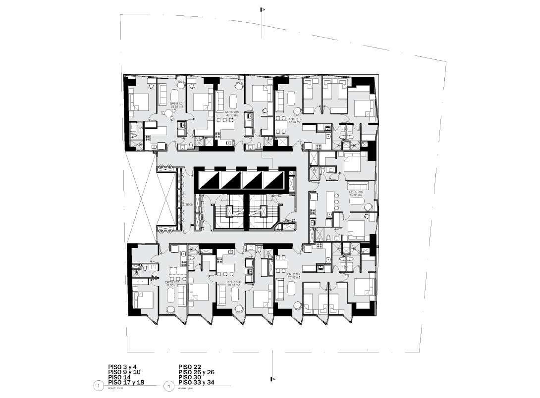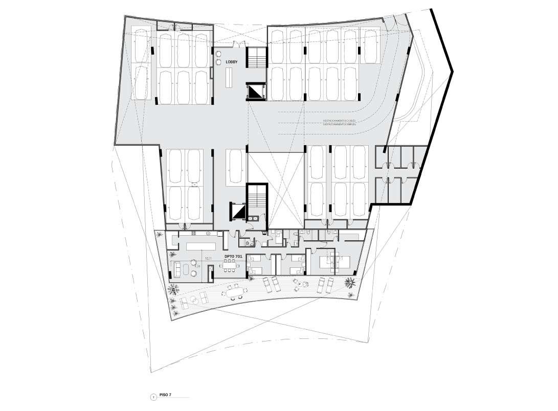 MAP. Diseña una fachada que busca el confort de los habitantes. Su composición se resume a losas vistas y parasoles diagonales que cubren los espacios interiores del fuerte asoleamiento de las tardes y permiten a su vez las vistas exteriores. La composición rítmica de estos elementos y las sombras que generan logran dinamismo y elegancia en este proyecto.