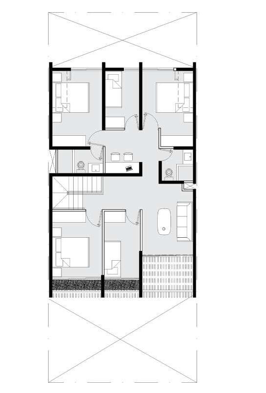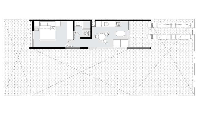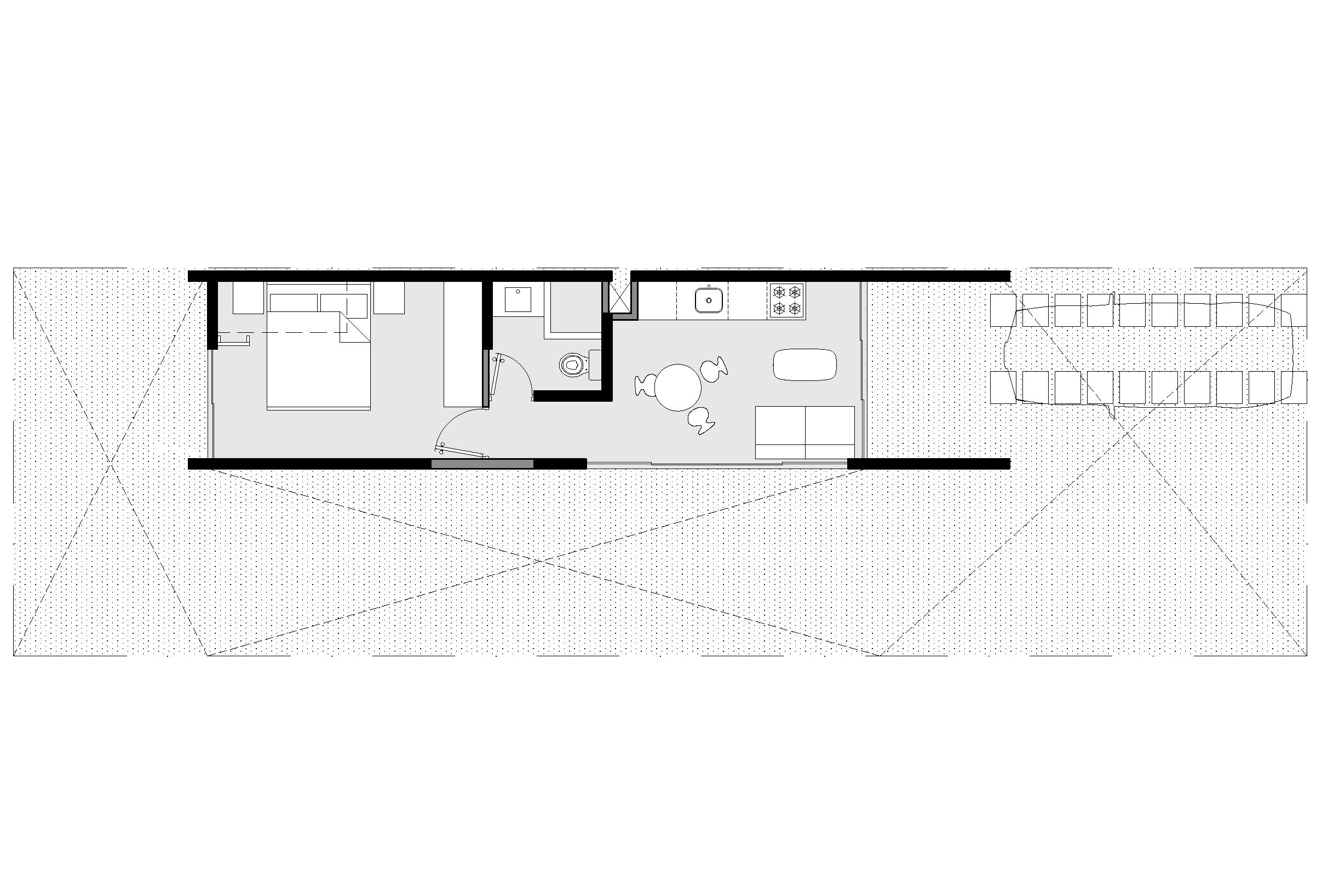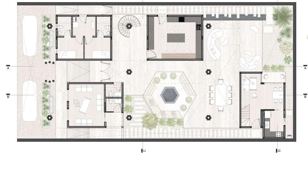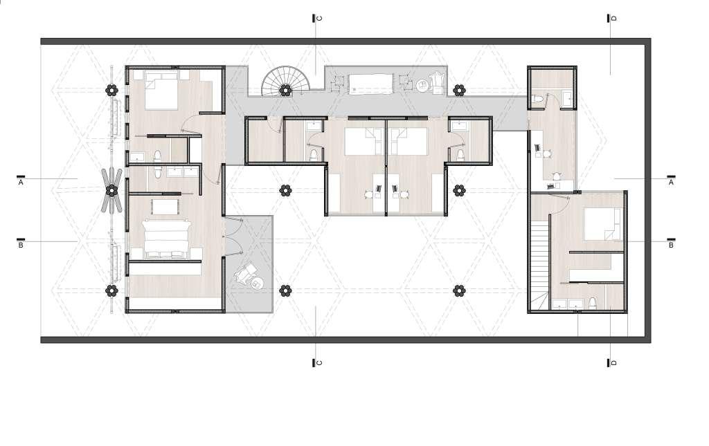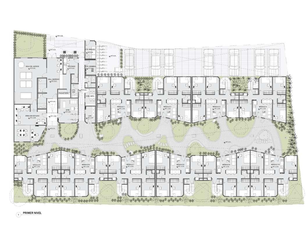 Cuenta con 70 habitaciones distribuidas en 10 módulos residenciales acompañadas de un módulo de áreas comunes y de servicio.