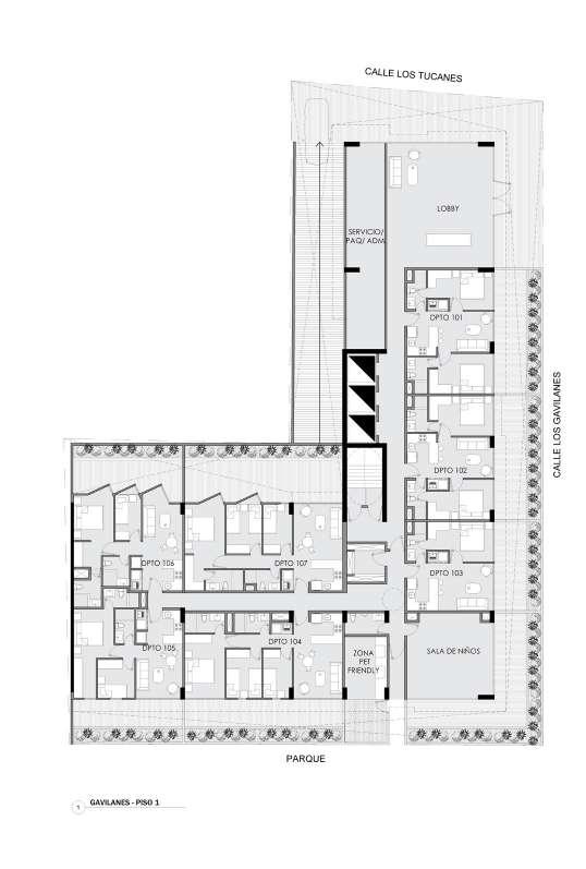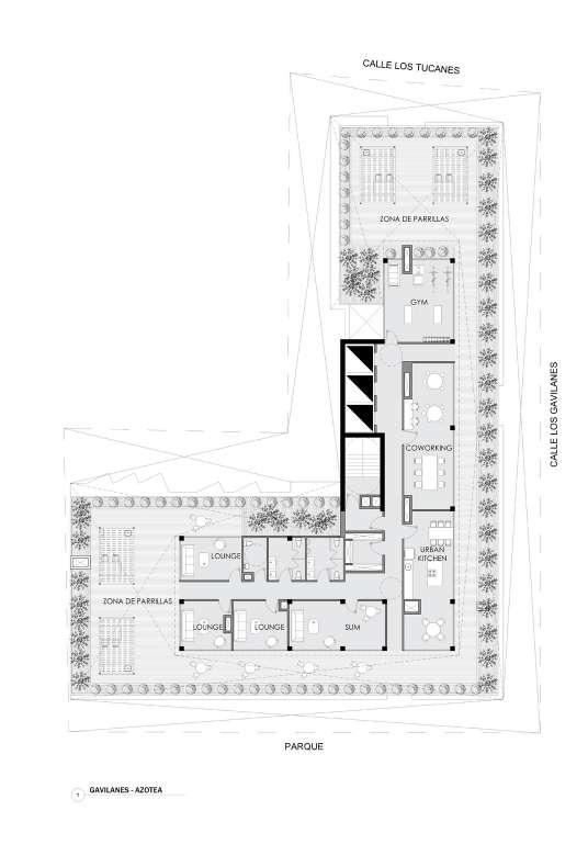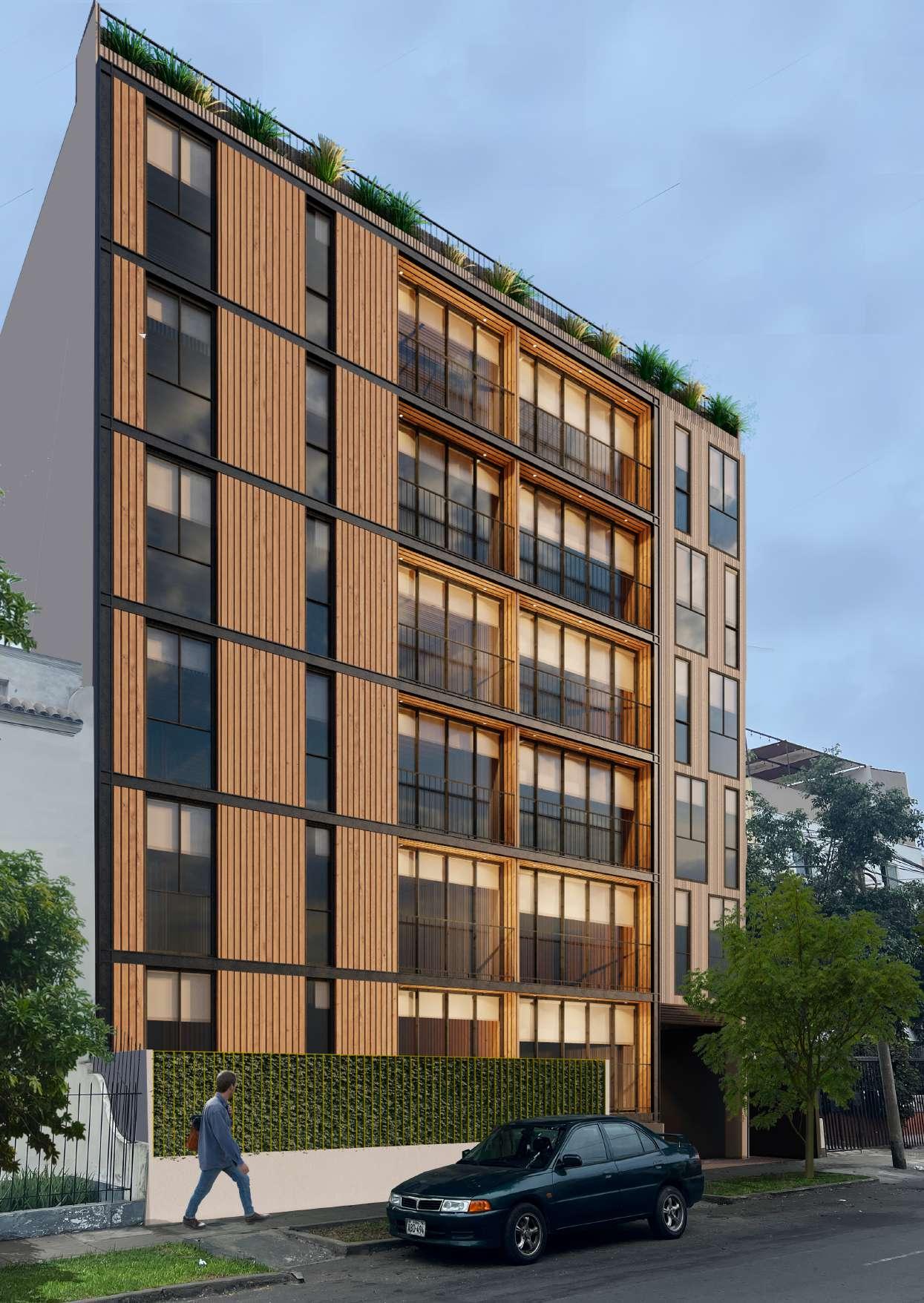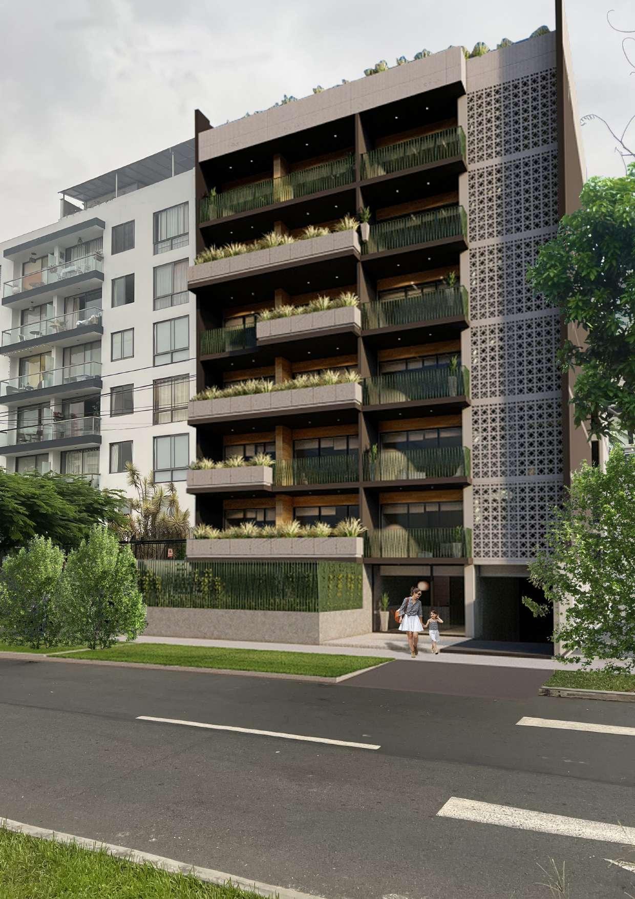 Si bien los parámetros del predio permiten una altura máxima de edificación de 3 pisos, se aplica el concepto de “mayor altura por consolidación” logrando 4 niveles dado que los lotes colindantes sobre esa cuadra han logrado desarrollar esta mayor altura por tener sus linderos posteriores hacia el Parque La Fuente.