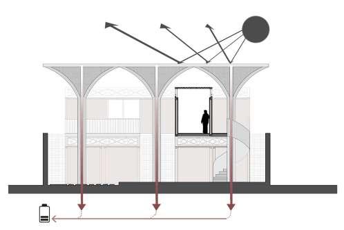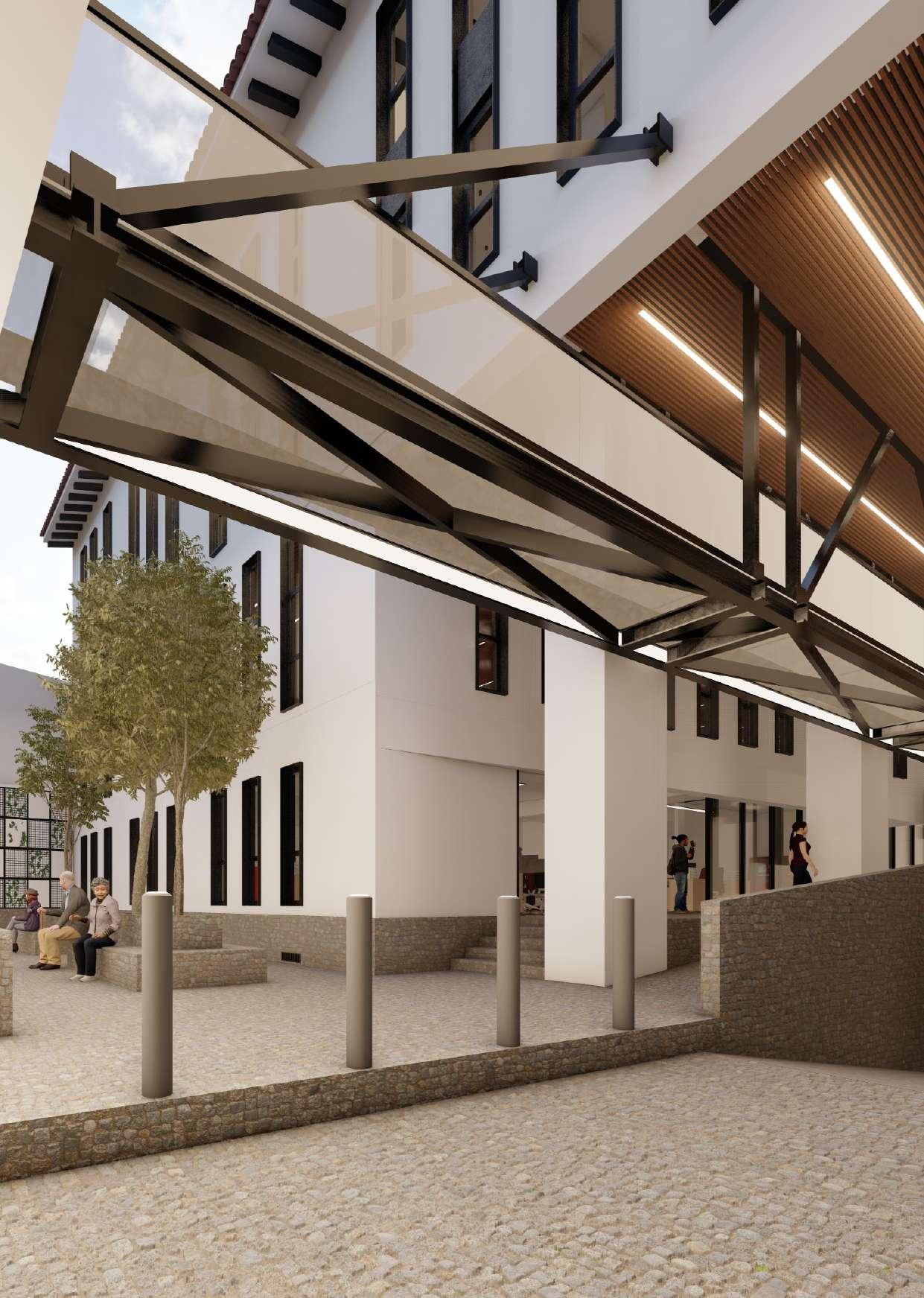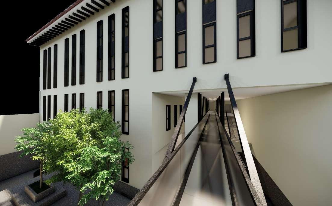 Aunque la intervención no será evidente desde las calles cercanas, se ha diseñado un edificio tradicional con retranqueo lateral en los niveles superiores para ser visible desde la Plaza de la Constitución, brindando una fachada agradable. Este retranqueo, junto con techos inclinados, aprovecha los vientos del sur-este como estrategia bioclimática.