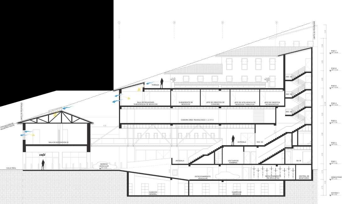 CUARTO DE SISTEMAS CUARTO DE MANTENIMIENTO CUARTO DE LIMPIEZA CONTROL PERSONAL SERVICIO TÓPICO CUARTO GRUPO ELECTRÓGENO CUARTO DE BASURA CASETA VIGILANCIA 18 11 ESTACIONAMIENTO 10 AUTOS ESTACIONAMIENTO 20 MOTOCICLETAS NPT 1.70 OFICINAS RESIDUOS PELIGROSOS RESIDUOS APROVECHABLES RESIDUOS ORGÁNICOS RESIDUOS NO APROVECHABLES B C D A B CENTRAL DE MONITOREO SEMISOTANO ACCESO VEHICULAR RUTA OFICINISTA RUTA SERVICIO D A A B CISTERNA DE AGUA TRATADA CISTERNA DE AGUA TRATADA 01 CISTERNA DE AGUAS GRISES CISTERNA DE AGUA DE CONSUMO CISTERNA DE AGUA CUARTO DE MAQUINAS CUARTO DE ARCHIVOS GENERAL ALMACEN LOGISTICA NPT 4.40 ALMACEN INFRAESTRUCTURA TECNOLOGICA ESC. VESTÍBULO SÓTANO 1 RUTA SERVICIO PISO 1 3 VESTUARIO HOMBRES NPT 0.00 ANTESALA PATIO CULTURAL SH.M SH.H SH.M INGRESO OFICINAS NPT -1.70 NPT 1.00 NPT 1.00 CAJEROS AUTOM. ASISTENTE DE BOVEDA PREBOVEDA SALA DE REUNIONES SALA DE ESPERA FORMATERIA A B OPERACIONES VENTANILLA VENTANILLA PLATAFORMA PROMOCIONES PENDIENTE 9.61% 2.10 para discapacitados templado incoloro CAFETIN NPT +0.10 SH.H DEP.2 DEP. SALA DE EXPO. NPT +0.10 pluvial PRES. ESC. 01 Elevador para CALLE REAL A2 NPT 1.00 DEMOLICIÓN MUROS DE ADOBE CONSTRUCCIÓN NUEVOS MUROS INTERVENCIÓN EN PATRIMONIO: ACCESO VEHICULAR ACCESO PEATONAL RUTA VISITANTE RUTA OFICINISTA RUTA SERVICIO RUTA INTERPRETE
