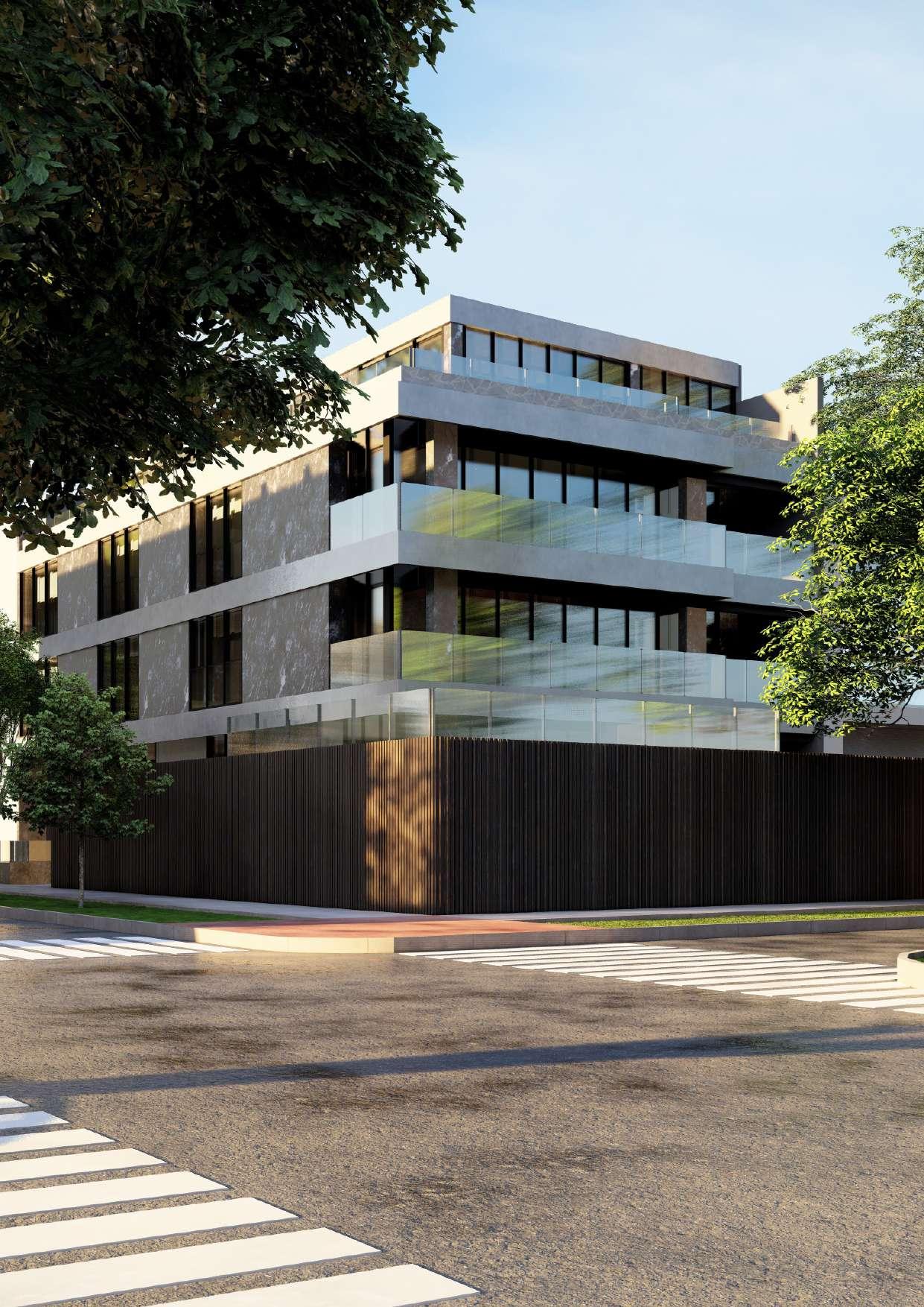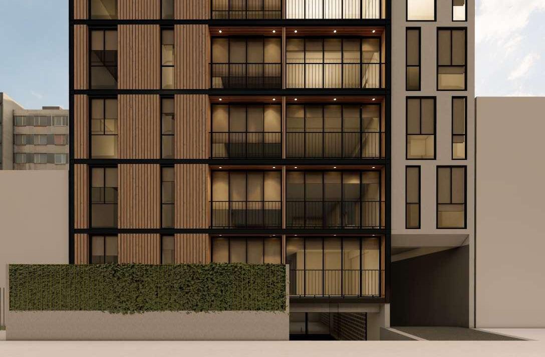 MAP. Plantea una fachada cálida y contemporánea. Su composición se resume a un marco que busca partir la fachada en 2 secciones y ventanas de proporción vertical. En cuanto a la materialidad, la fachada se compone por el marco metálico en color charcoal, microcemento entablillado y pigmentado en color madera y color gris.