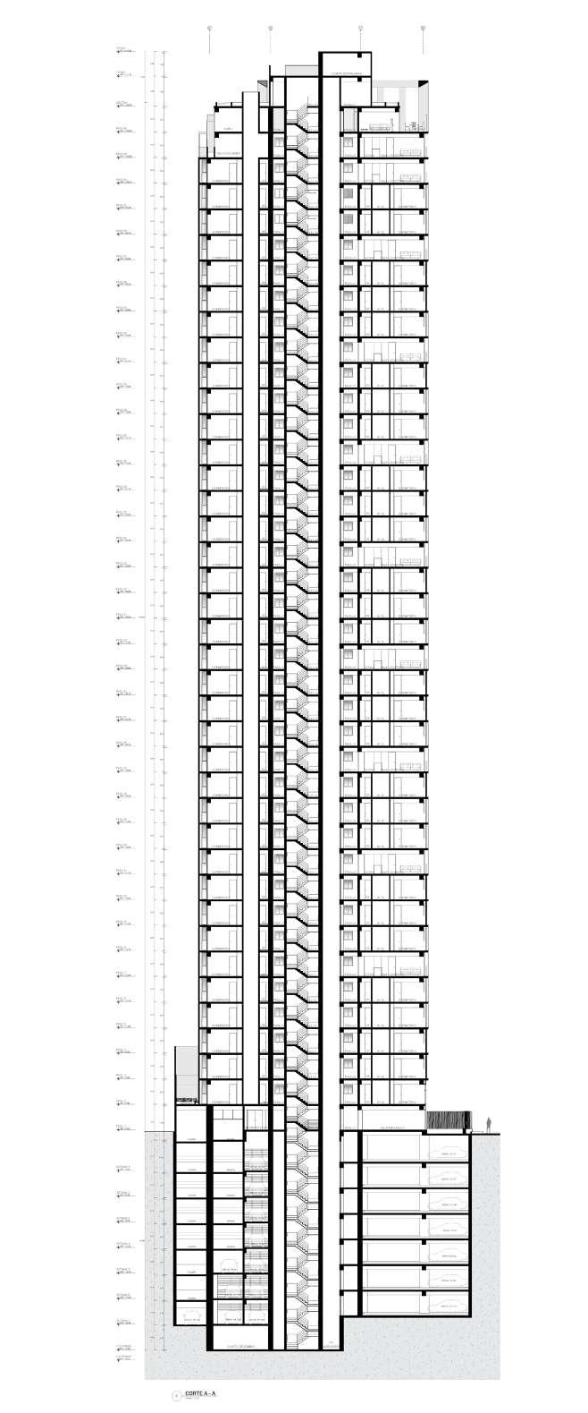 Además, se ha integrado una apertura en la fachada inferior para acceso durante la construcción y facilitar el ingreso vehicular, sirviendo también como atracción para los peatones hacia la plaza cultural. Para preservar edificios monumentales cercanos, se evitan excavaciones profundas, cumpliendo con el programa arquitectónico mediante un único nivel subterráneo retirado lateral y frontalmente.