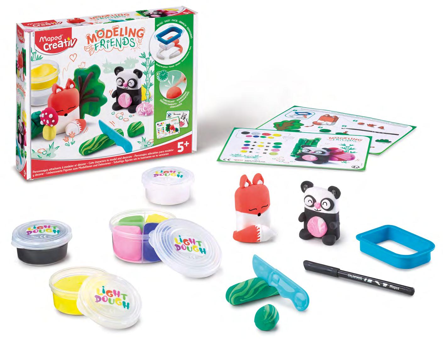 5+ Contains 4 x 18 g pots of airdry clay, 1 x 31 g pot of 4 colour airdry clay, 1 cutter, 1 small plastic knife, 1 black felt-tip pen, 1 manual.