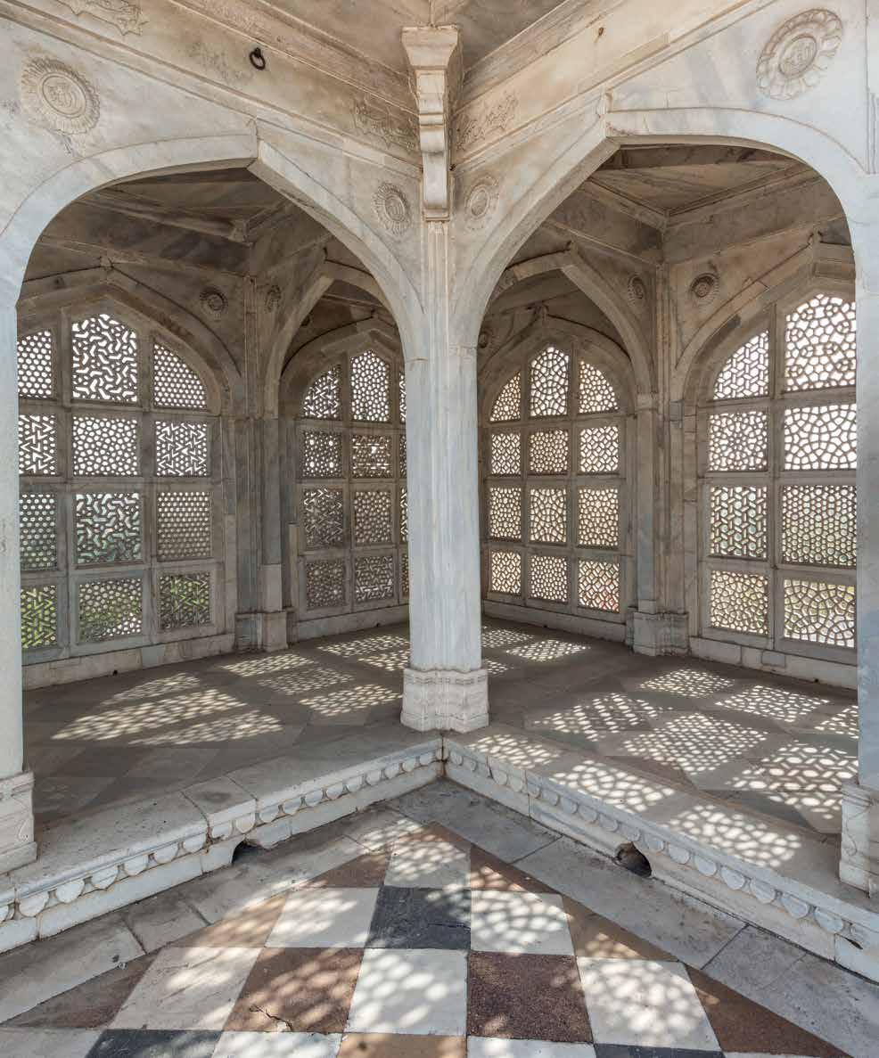 Early Mughal jalis in the buildings of Akbar and Jahangir combined these formulas with fresh inspiration and new materials. These jalis continued to stay true to the geometric patterns and stellate designs that had evolved in the wider Persianate world while also integrating auspicious Hindu and Jain motifs such as floral heads and swastika meanders (see ‘Divine Order’). Mughal jalis in Shah Jahani buildings took off in another stylistic direction, abandoning celestial order for paradisiacal floral trellises of organic form (see ‘Heavenly Gardens’ and essay by Ebba Koch). Meanwhile, contemporary Deccan sultanates in the south had their own distinctive styles of architecture, featuring fantastical and calligraphic jali designs and dazzling geometry in carved stucco (see ‘Fantasy and Formality’). Through the eighteenth and nineteenth centuries, the imperial Mughal style of cusped arches and floral screens became spectacularly elaborated at Rajput forts and palaces, especially in the secluded areas of courtly women (see ‘Jali Mania’). This ‘jali mania’ evolved into further stylistic variations in the buildings of the British Raj and the ‘IndoSaracenic’ style of monuments, such as the Gateway of India in Mumbai. Innovations of the jali within global architecture of the modern age and as a form of individual expression by contemporary artists continue to the present day (see ‘Jali in the Modern Age’).