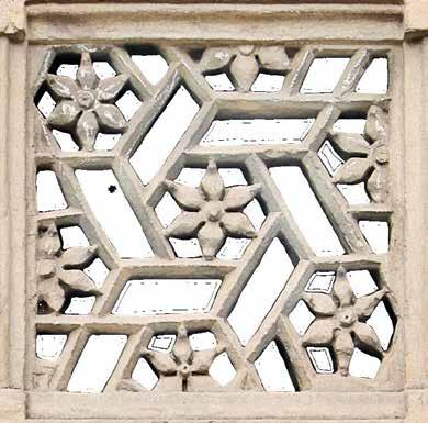 The classification of temple jali designs and their symbolism has been expounded in modern studies.3 A lexicon of Sanskrit terms for the individual designs implies that much of this nomenclature stayed unchanged over the centuries.4 This would suggest that when later building styles such as mosques were outfitted with jalis, the same