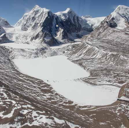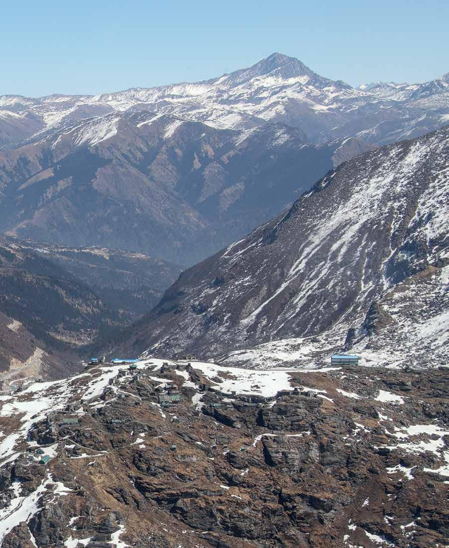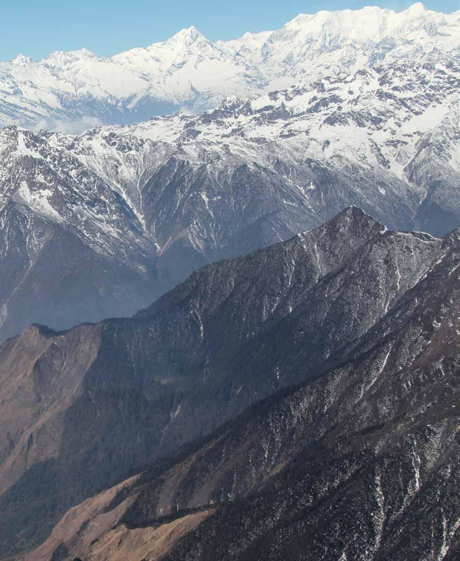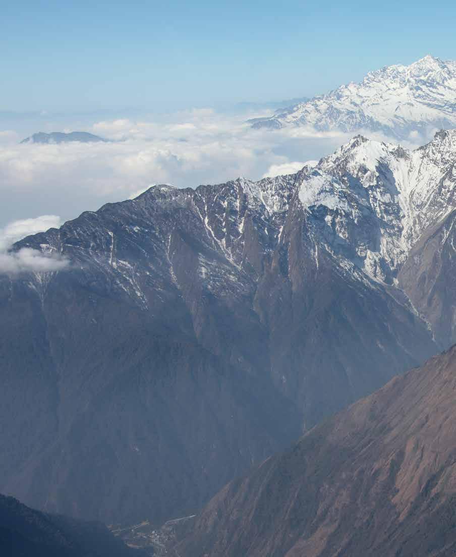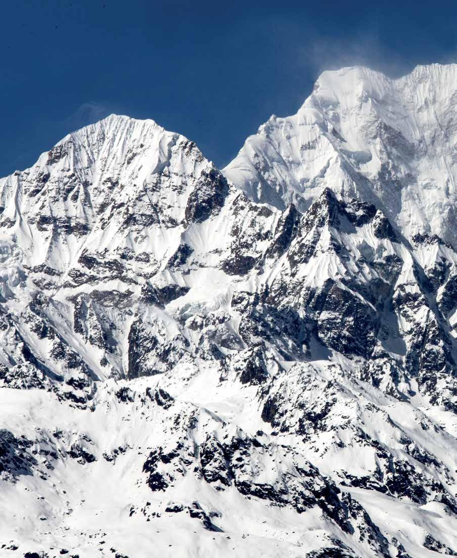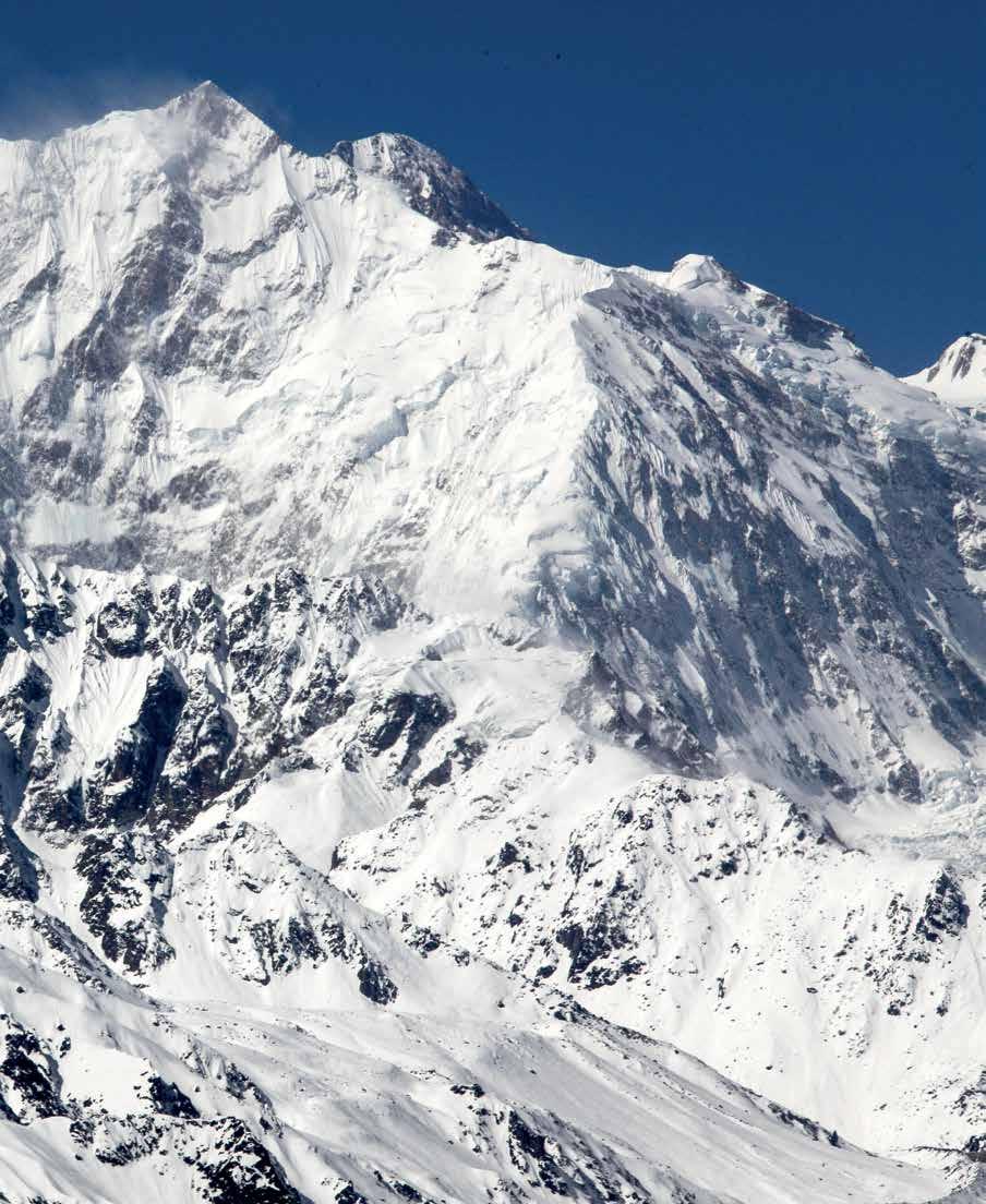 pages 4–5 | A Cheetah helicopter’s rotors push its limits, rising to these rarefied heights to capture a spectacular view of the less familiar north face of Kanchenjunga. A rare day, when against cloudless skies the planet’s third-highest peak paints a magnificent picture.