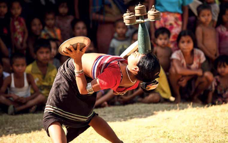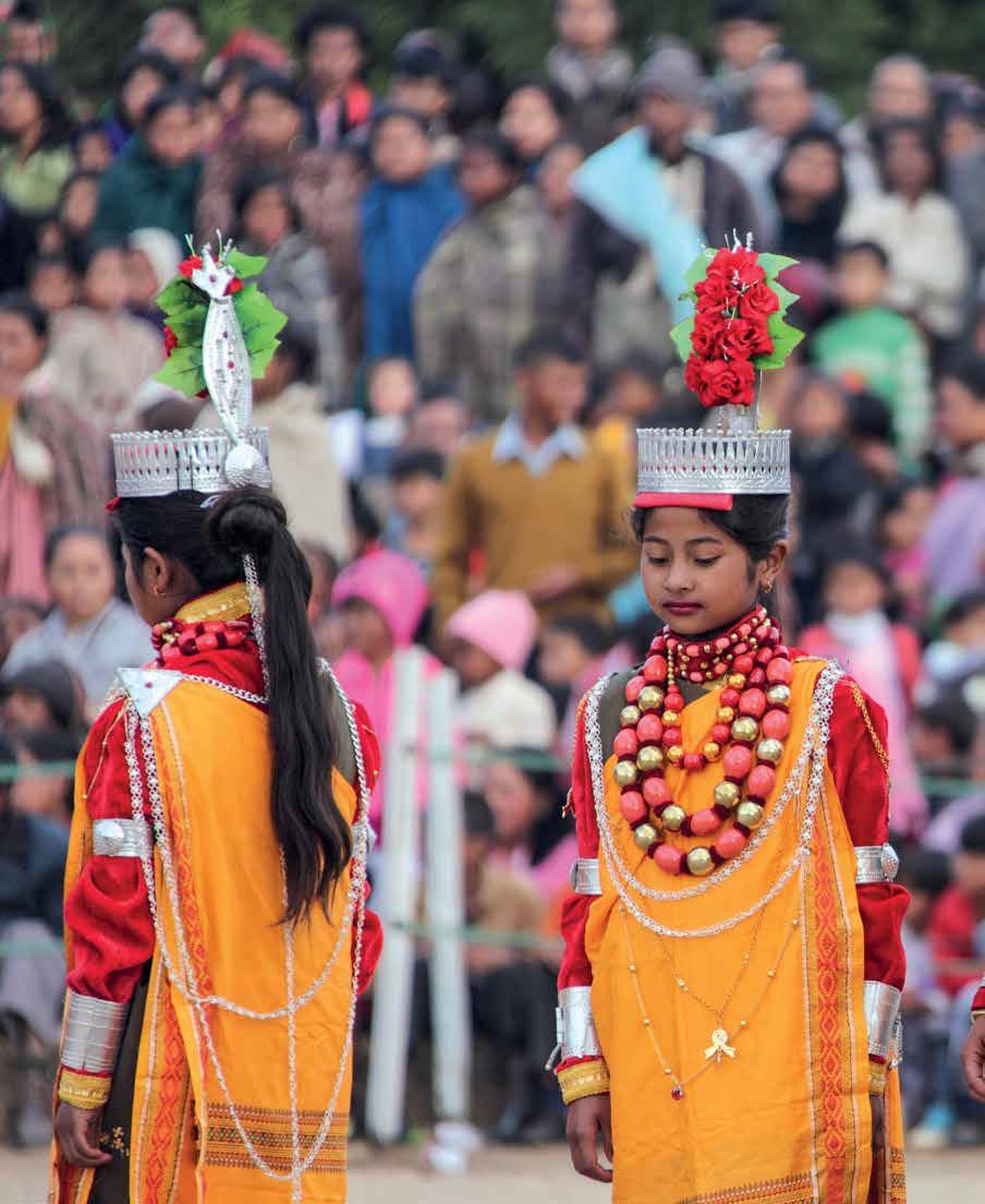pages 6–7 | The crowning glory of all Khasi festivals is the ancient and hugely popular Ka Pomblang Nongkrem. A thanksgiving ceremony for a good harvest, the celebrations around Nongkrem extend over five days, and the religious rituals often give over to the dancing. It is celebrated every year at Smit village, 11 km (7 mi.) from Shillong. Photograph by Somu John Ingty.