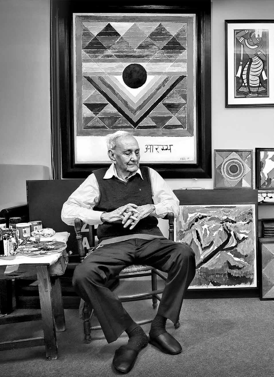 When he arrived in New Delhi from Paris in the winter of 2010, S.H. Raza moved into an apartment that would be his studio-cum-home in a South Delhi colony and continues to house the eponymously named foundation set up for multidisciplinary arts post his passing in 2016. It was not easy to eliminate six decades of Gaelic living from his system, but he got by on a little red wine and slowly, with his work that you can still see stacked against the walls of his studio. An easel holds the last painting he was working on at the time of his demise. Elsewhere in the room are objects that have been part of his studio for as long as anyone can remember: a Ganesh murti, a handful of mitti that he had carried from his native Mandla district to Paris and then back, his Gandhi bhajans – an invocation with which he would begin his work in the morning. When he could, he liked to visit Rajghat to pay obeisance to the Mahatma.