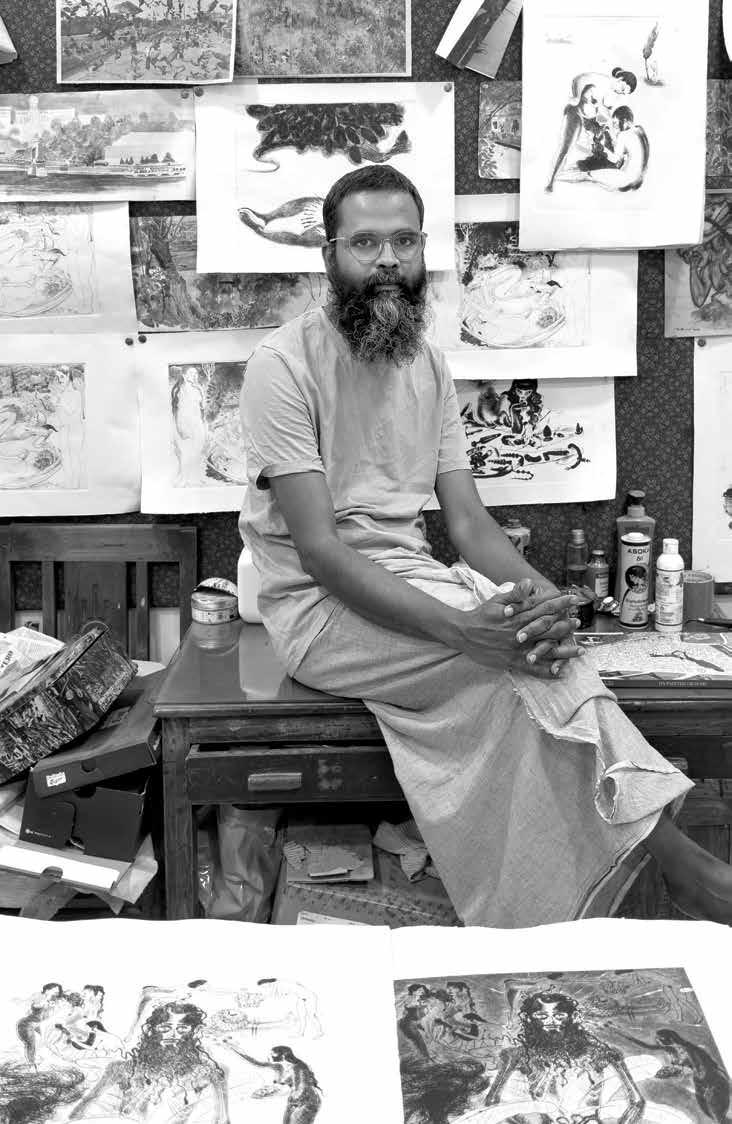 Venkanna fills sketchbooks with his drawings – many, many of them – of which some might make it as paintings, though he’s more likely to paint directly, using egg tempera, a process that requires a hard surface, especially since, in recent years, he has impressively scaled up the size of his paintings. A table adds height when he paints standing up. Or he could crouch on the floor, or sit at a desk. Unlike other artists, he doesn’t mind having viewers while he’s painting, though this is rare; he’s happy sharing what’s he’s completed too, fending the expected questions around nudity in his work.