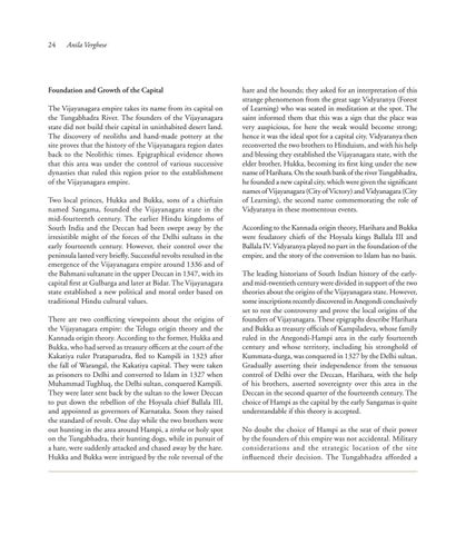 hare and the hounds; they asked for an interpretation of this strange phenomenon from the great sage Vidyaranya (Forest of Learning) who was seated in meditation at the spot. The saint informed them that this was a sign that the place was very auspicious, for here the weak would become strong; hence it was the ideal spot for a capital city. Vidyaranya then reconverted the two brothers to Hinduism, and with his help and blessing they established the Vijayanagara state, with the elder brother, Hukka, becoming its first king under the new name of Harihara. On the south bank of the river Tungabhadra, he founded a new capital city, which were given the significant names of Vijayanagara (City of Victory) and Vidyanagara (City of Learning), the second name commemorating the role of Vidyaranya in these momentous events. According to the Kannada origin theory, Harihara and Bukka were feudatory chiefs of the Hoysala kings Ballala III and Ballala IV. Vidyaranya played no part in the foundation of the empire, and the story of the conversion to Islam has no basis. The leading historians of South Indian history of the earlyand mid-twentieth century were divided in support of the two theories about the origins of the Vijayanagara state. However, some inscriptions recently discovered in Anegondi conclusively set to rest the controversy and prove the local origins of the founders of Vijayanagara. These epigraphs describe Harihara and Bukka as treasury officials of Kampiladeva, whose family ruled in the Anegondi-Hampi area in the early fourteenth century and whose territory, including his stronghold of Kummata-durga, was conquered in 1327 by the Delhi sultan. Gradually asserting their independence from the tenuous control of Delhi over the Deccan, Harihara, with the help of his brothers, asserted sovereignty over this area in the Deccan in the second quarter of the fourteenth century. The choice of Hampi as the capital by the early Sangamas is quite understandable if this theory is accepted. No doubt the choice of Hampi as the seat of their power by the founders of this empire was not accidental. Military considerations and the strategic location of the site influenced their decision. The Tungabhadra afforded a