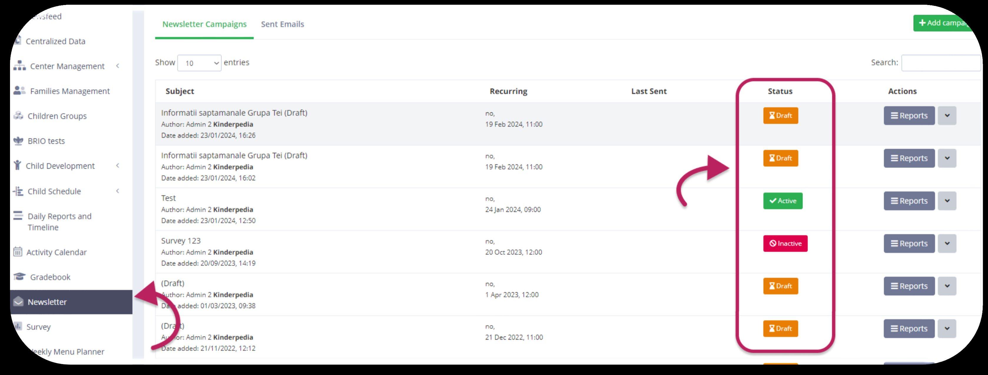 On the page with the Newsletters list, on the right side under Status column, you will be able to see the status of each newsletter. The status can be: